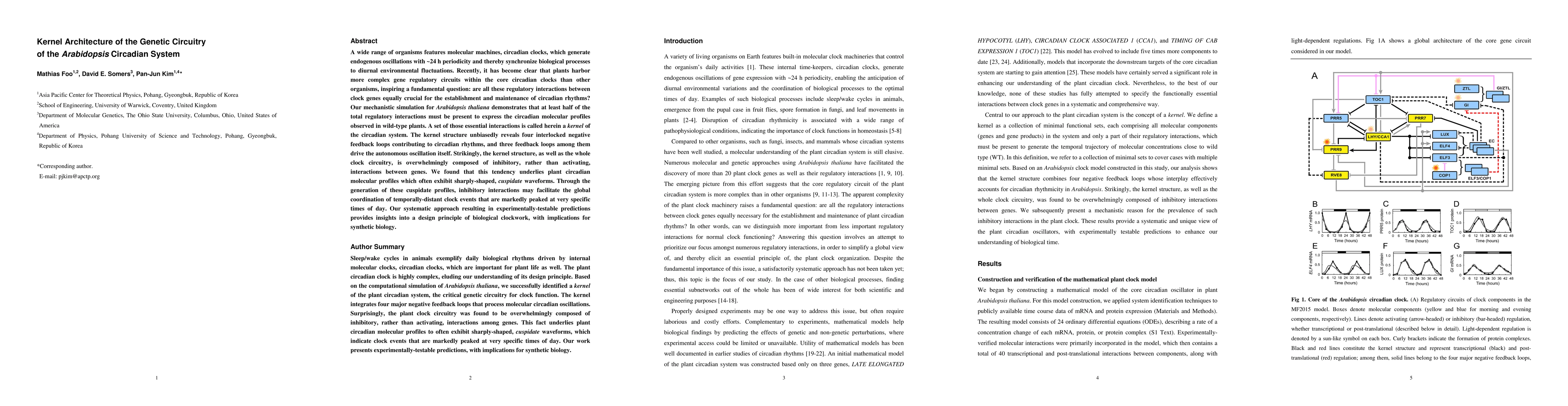 This paper identifies a "kernel" of essential regulatory interactions within the Arabidopsis circadian system, revealing four interlocked inhibitory feedback loops that drive the autonomous oscillation. The study highlights the predominance of inhibitory interactions in shaping sharply-peaked circadian molecular profiles and suggests their role in coordinating temporally-distant clock events.