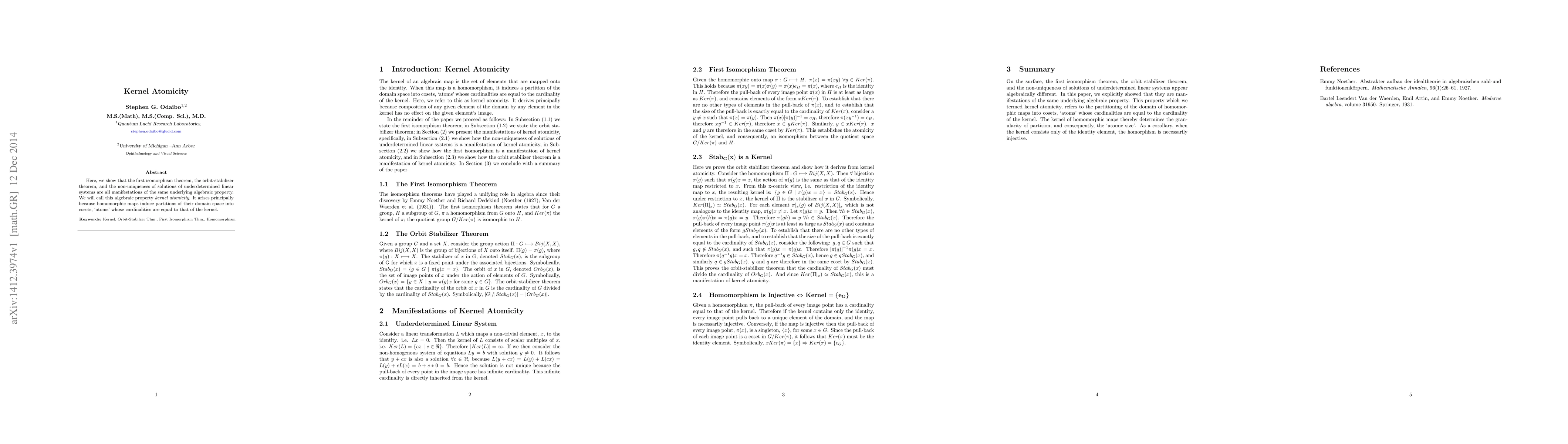 Here, we show that the first isomorphism theorem, the orbit-stabilizer theorem, and the non-uniqueness of solutions of underdetermined linear systems are all manifestations of the same underlying algebraic property. We will call this algebraic property kernel atomicity. It arises principally because homomorphic maps induce partitions of their domain space into cosets, 'atoms' whose cardinalities are equal to that of the kernel.
