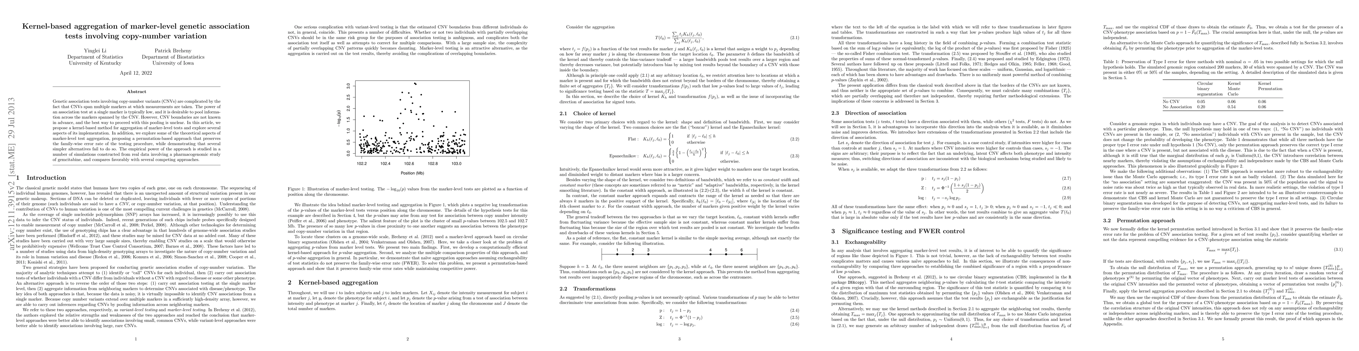 This research proposes a kernel-based method to aggregate marker-level genetic tests involving complex copy-number variations (CNVs). It explores theoretical aspects, ensuring a controlled family-wise error rate, and demonstrates superior empirical power compared to alternative methods in simulated pharmacogenomic studies.