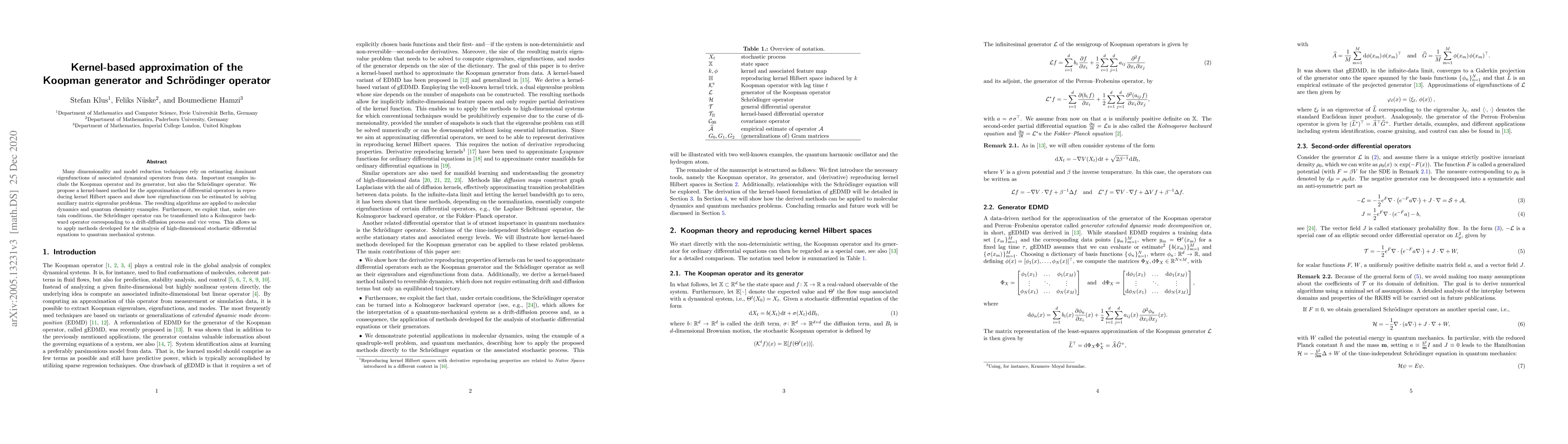 This paper proposes a kernel-based method for approximating the Koopman generator and Schrödinger operators, enabling the estimation of dominant eigenfunctions from data. The method transforms the Schrödinger operator into a Kolmogorov backward operator, allowing the application of stochastic differential equation analysis techniques to quantum mechanical systems.
