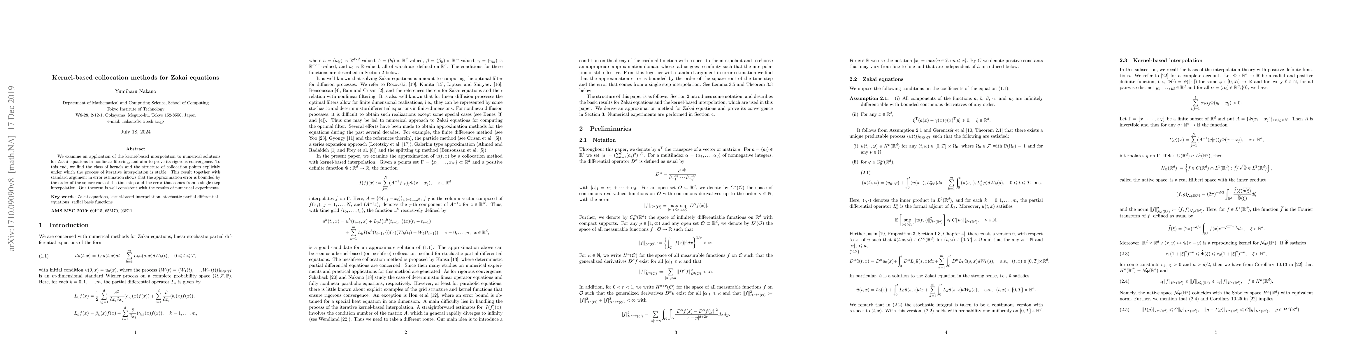 We examine an application of the kernel-based interpolation to numerical solutions for Zakai equations in nonlinear filtering, and aim to prove its rigorous convergence. To this end, we find the class of kernels and the structure of collocation points explicitly under which the process of iterative interpolation is stable. This result together with standard argument in error estimation shows that the approximation error is bounded by the order of the square root of the time step and the error that comes from a single step interpolation. Our theorem is well consistent with the results of numerical experiments.