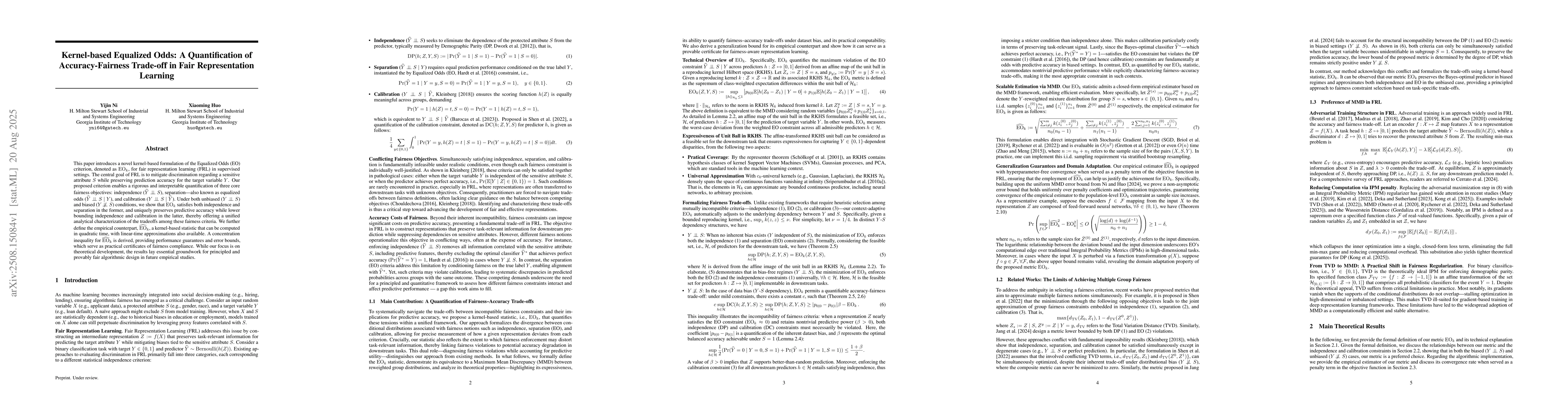 This paper introduces a novel kernel-based formulation of the Equalized Odds (EO) criterion, denoted as $EO_k$, for fair representation learning (FRL) in supervised settings. The central goal of FRL is to mitigate discrimination regarding a sensitive attribute $S$ while preserving prediction accuracy for the target variable $Y$. Our proposed criterion enables a rigorous and interpretable quantification of three core fairness objectives: independence (prediction $\hat{Y}$ is independent of $S$), separation (also known as equalized odds; prediction $\hat{Y}$ is independent with $S$ conditioned on target attribute $Y$), and calibration ($Y$ is independent of $S$ conditioned on the prediction $\hat{Y}$). Under both unbiased ($Y$ is independent of $S$) and biased ($Y$ depends on $S$) conditions, we show that $EO_k$ satisfies both independence and separation in the former, and uniquely preserves predictive accuracy while lower bounding independence and calibration in the latter, thereby offering a unified analytical characterization of the tradeoffs among these fairness criteria. We further define the empirical counterpart, $\hat{EO}_k$, a kernel-based statistic that can be computed in quadratic time, with linear-time approximations also available. A concentration inequality for $\hat{EO}_k$ is derived, providing performance guarantees and error bounds, which serve as practical certificates of fairness compliance. While our focus is on theoretical development, the results lay essential groundwork for principled and provably fair algorithmic design in future empirical studies.