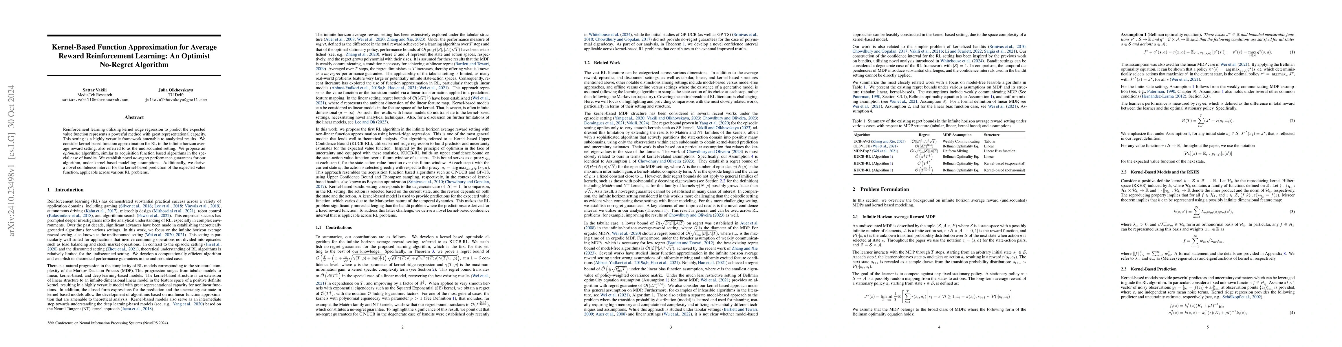 This paper proposes an optimistic no-regret algorithm for reinforcement learning in the undiscounted average reward setting, utilizing kernel ridge regression for function approximation. It establishes novel no-regret guarantees and a confidence interval for the predicted value function under kernel-based assumptions.