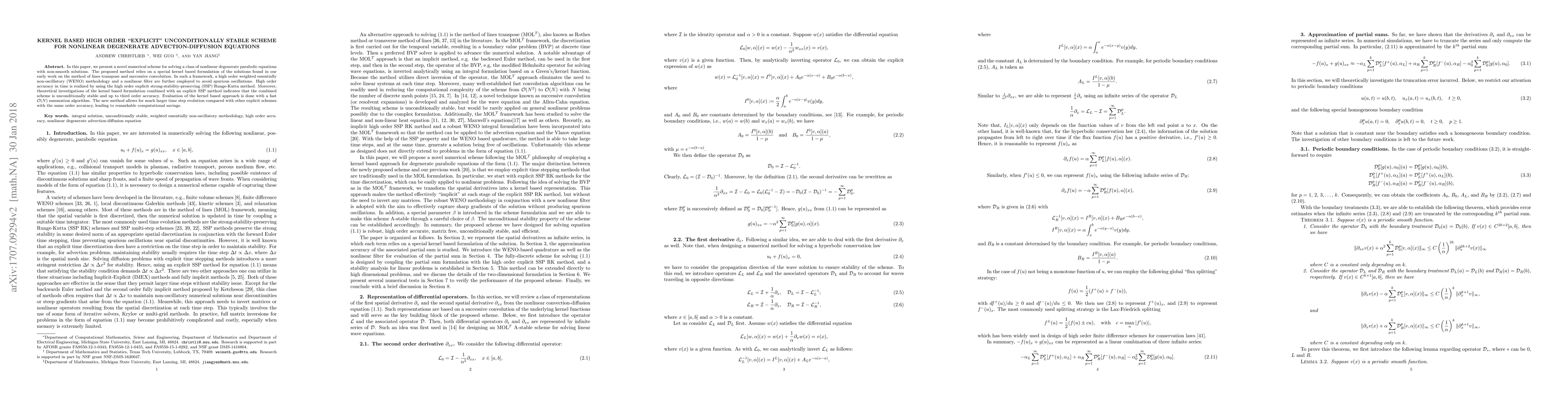 This paper introduces a novel kernel-based numerical scheme for solving nonlinear degenerate parabolic equations, utilizing high-order WENO and SSP methods for stability and accuracy. The scheme achieves third-order accuracy and is unconditionally stable, offering significant computational savings due to larger allowable time steps.