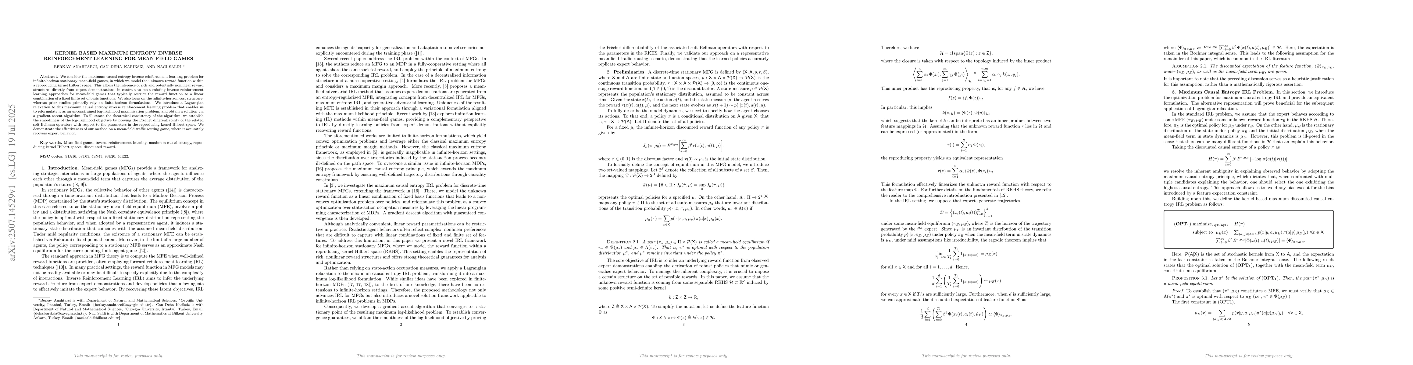 We consider the maximum causal entropy inverse reinforcement learning problem for infinite-horizon stationary mean-field games, in which we model the unknown reward function within a reproducing kernel Hilbert space. This allows the inference of rich and potentially nonlinear reward structures directly from expert demonstrations, in contrast to most existing inverse reinforcement learning approaches for mean-field games that typically restrict the reward function to a linear combination of a fixed finite set of basis functions. We also focus on the infinite-horizon cost structure, whereas prior studies primarily rely on finite-horizon formulations. We introduce a Lagrangian relaxation to this maximum causal entropy inverse reinforcement learning problem that enables us to reformulate it as an unconstrained log-likelihood maximization problem, and obtain a solution \lk{via} a gradient ascent algorithm. To illustrate the theoretical consistency of the algorithm, we establish the smoothness of the log-likelihood objective by proving the Fr\'echet differentiability of the related soft Bellman operators with respect to the parameters in the reproducing kernel Hilbert space. We demonstrate the effectiveness of our method on a mean-field traffic routing game, where it accurately recovers expert behavior.