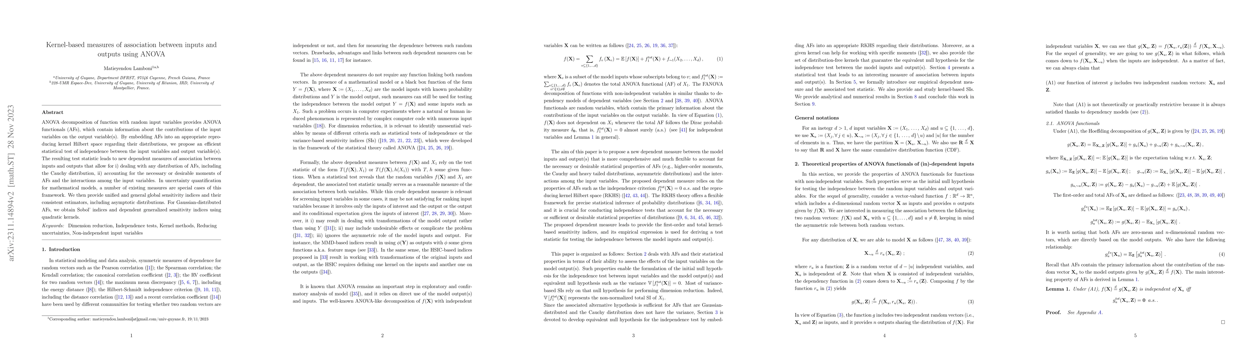 This paper proposes kernel-based measures of association between input and output variables using ANOVA decomposition, embedding ANOVA functionals into a reproducing kernel Hilbert space for statistical independence testing. It introduces new dependent measures of association that handle various distributions and moments, generalizing existing sensitivity indices and providing consistent estimators.