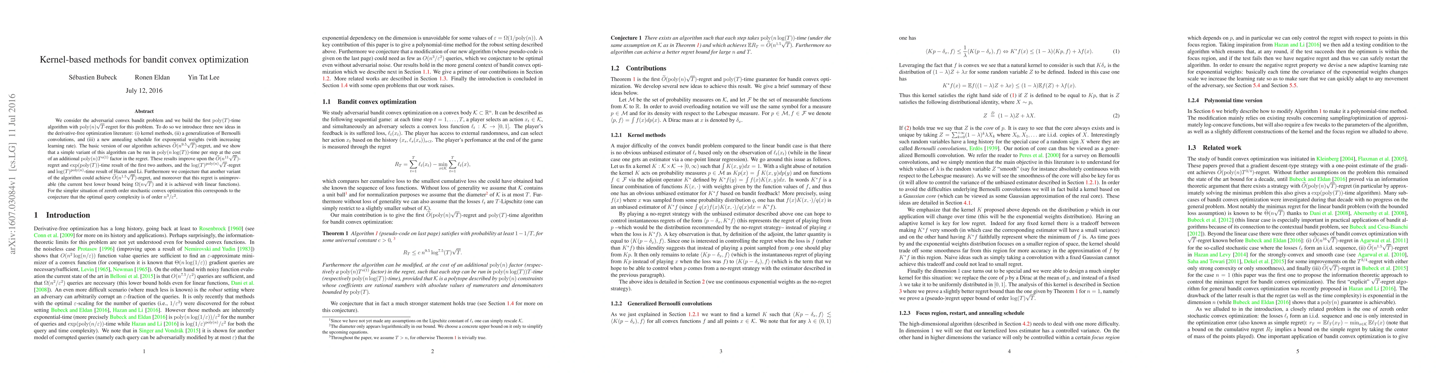 We consider the adversarial convex bandit problem and we build the first $\mathrm{poly}(T)$-time algorithm with $\mathrm{poly}(n) \sqrt{T}$-regret for this problem. To do so we introduce three new ideas in the derivative-free optimization literature: (i) kernel methods, (ii) a generalization of Bernoulli convolutions, and (iii) a new annealing schedule for exponential weights (with increasing learning rate). The basic version of our algorithm achieves $\tilde{O}(n^{9.5} \sqrt{T})$-regret, and we show that a simple variant of this algorithm can be run in $\mathrm{poly}(n \log(T))$-time per step at the cost of an additional $\mathrm{poly}(n) T^{o(1)}$ factor in the regret. These results improve upon the $\tilde{O}(n^{11} \sqrt{T})$-regret and $\exp(\mathrm{poly}(T))$-time result of the first two authors, and the $\log(T)^{\mathrm{poly}(n)} \sqrt{T}$-regret and $\log(T)^{\mathrm{poly}(n)}$-time result of Hazan and Li. Furthermore we conjecture that another variant of the algorithm could achieve $\tilde{O}(n^{1.5} \sqrt{T})$-regret, and moreover that this regret is unimprovable (the current best lower bound being $\Omega(n \sqrt{T})$ and it is achieved with linear functions). For the simpler situation of zeroth order stochastic convex optimization this corresponds to the conjecture that the optimal query complexity is of order $n^3 / \epsilon^2$.