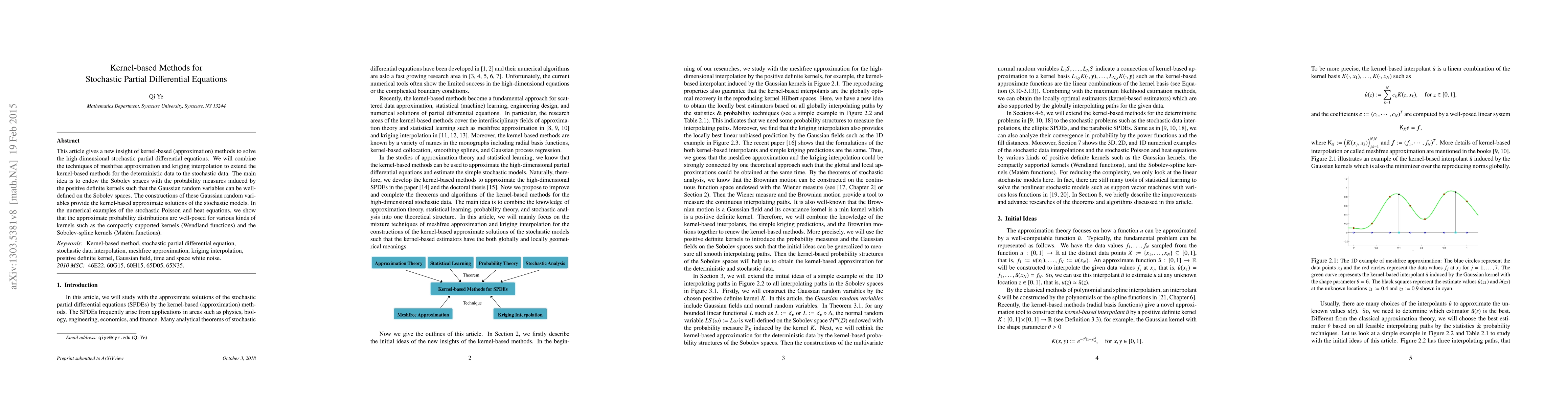 This article gives a new insight of kernel-based (approximation) methods to solve the high-dimensional stochastic partial differential equations. We will combine the techniques of meshfree approximation and kriging interpolation to extend the kernel-based methods for the deterministic data to the stochastic data. The main idea is to endow the Sobolev spaces with the probability measures induced by the positive definite kernels such that the Gaussian random variables can be well-defined on the Sobolev spaces. The constructions of these Gaussian random variables provide the kernel-based approximate solutions of the stochastic models. In the numerical examples of the stochastic Poisson and heat equations, we show that the approximate probability distributions are well-posed for various kinds of kernels such as the compactly supported kernels (Wendland functions) and the Sobolev-spline kernels (Mat\'ern functions).