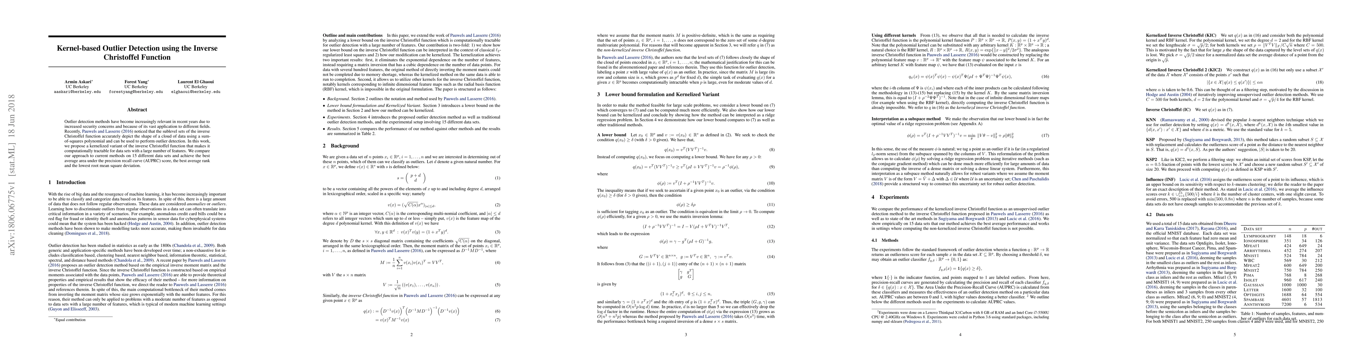 Outlier detection methods have become increasingly relevant in recent years due to increased security concerns and because of its vast application to different fields. Recently, Pauwels and Lasserre (2016) noticed that the sublevel sets of the inverse Christoffel function accurately depict the shape of a cloud of data using a sum-of-squares polynomial and can be used to perform outlier detection. In this work, we propose a kernelized variant of the inverse Christoffel function that makes it computationally tractable for data sets with a large number of features. We compare our approach to current methods on 15 different data sets and achieve the best average area under the precision recall curve (AUPRC) score, the best average rank and the lowest root mean square deviation.