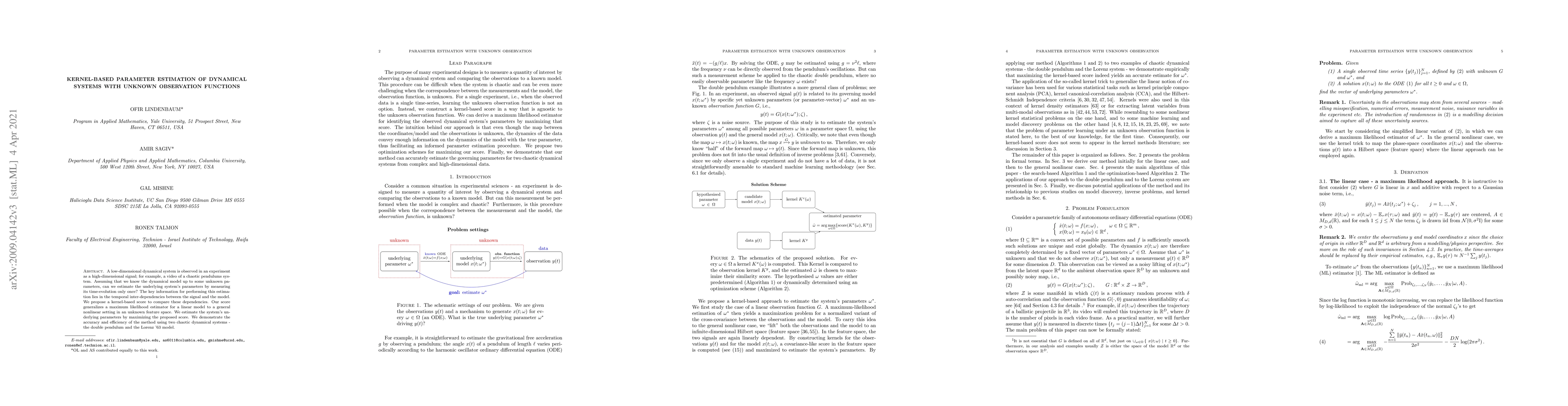 This paper proposes a kernel-based method for estimating parameters of low-dimensional dynamical systems observed as high-dimensional signals, using a score that captures temporal inter-dependencies. The method generalizes maximum likelihood estimation to nonlinear settings and is demonstrated on chaotic systems like the double pendulum and Lorenz '63 model.