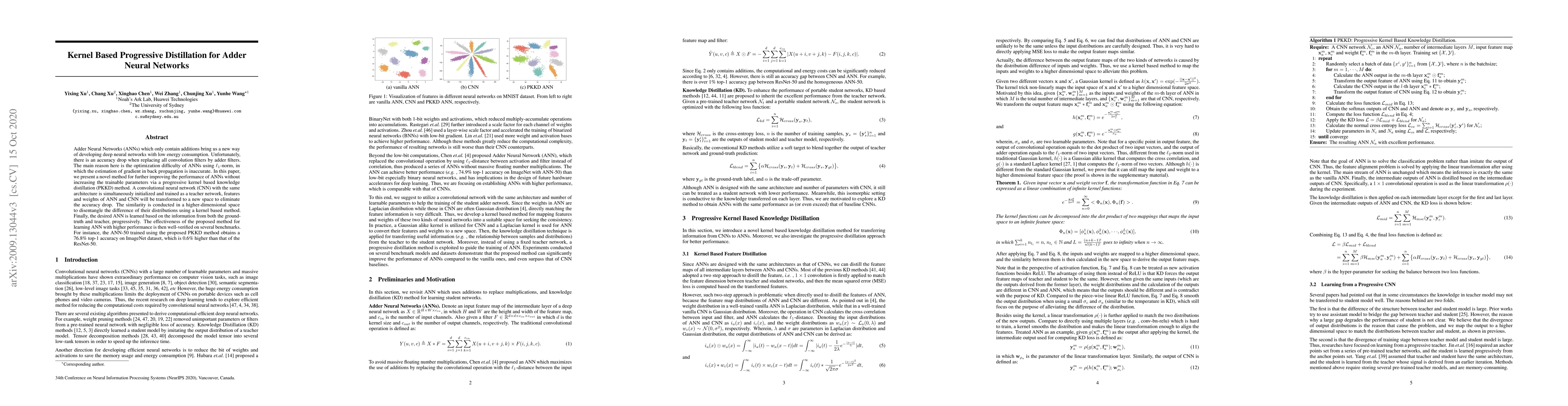 Adder Neural Networks (ANNs) which only contain additions bring us a new way of developing deep neural networks with low energy consumption. Unfortunately, there is an accuracy drop when replacing all convolution filters by adder filters. The main reason here is the optimization difficulty of ANNs using $\ell_1$-norm, in which the estimation of gradient in back propagation is inaccurate. In this paper, we present a novel method for further improving the performance of ANNs without increasing the trainable parameters via a progressive kernel based knowledge distillation (PKKD) method. A convolutional neural network (CNN) with the same architecture is simultaneously initialized and trained as a teacher network, features and weights of ANN and CNN will be transformed to a new space to eliminate the accuracy drop. The similarity is conducted in a higher-dimensional space to disentangle the difference of their distributions using a kernel based method. Finally, the desired ANN is learned based on the information from both the ground-truth and teacher, progressively. The effectiveness of the proposed method for learning ANN with higher performance is then well-verified on several benchmarks. For instance, the ANN-50 trained using the proposed PKKD method obtains a 76.8\% top-1 accuracy on ImageNet dataset, which is 0.6\% higher than that of the ResNet-50.