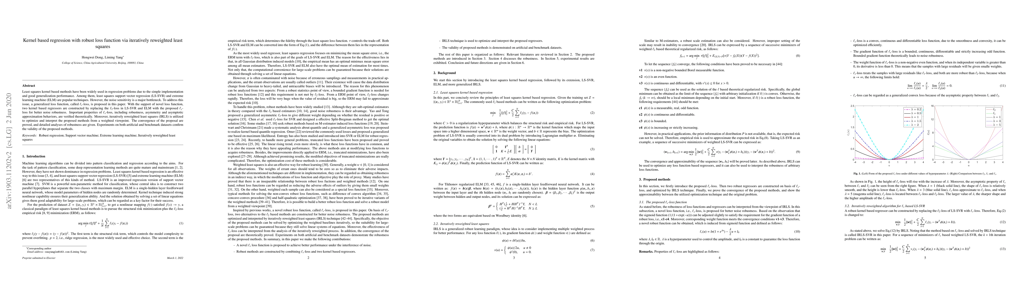 This paper proposes a generalized $\ell_s$-loss function to enhance the noise robustness of kernel-based regression methods, replacing the traditional $\ell_2$-loss in LS-SVR and ELM. The iteratively reweighted least squares (IRLS) optimization technique is used to implement the new loss function, and theoretical properties and experimental validations confirm its effectiveness.