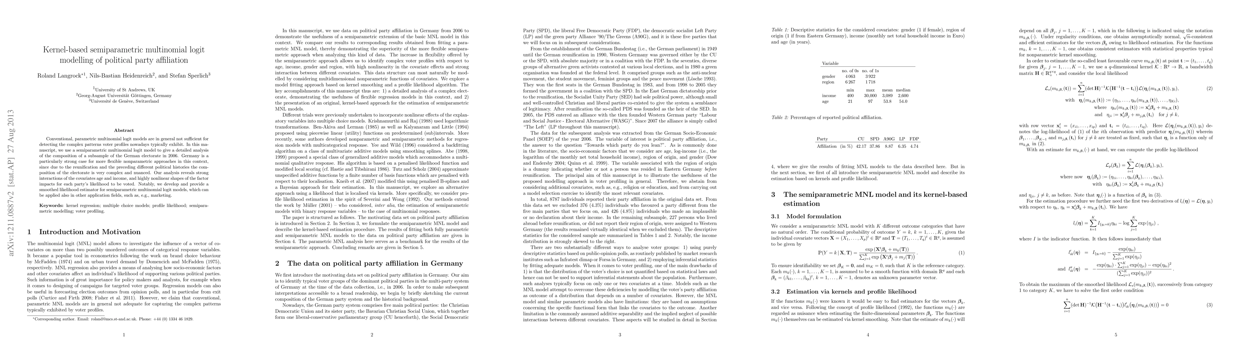This paper proposes a semiparametric multinomial logit model to analyze voter profiles in the 2006 German electorate, revealing complex interactions between age, income, and party voting likelihood. The study introduces a smoothed likelihood estimator for these models, applicable beyond political science, such as in marketing.