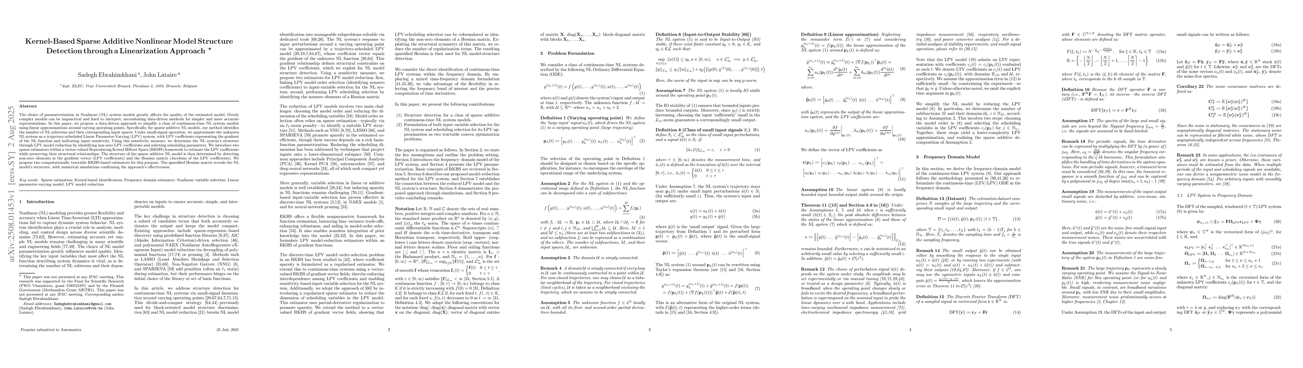 The choice of parameterization in Nonlinear (NL) system models greatly affects the quality of the estimated model. Overly complex models can be impractical and hard to interpret, necessitating data-driven methods for simpler and more accurate representations. In this paper, we propose a data-driven approach to simplify a class of continuous-time NL system models using linear approximations around varying operating points. Specifically, for sparse additive NL models, our method identifies the number of NL subterms and their corresponding input spaces. Under small-signal operation, we approximate the unknown NL system as a trajectory-scheduled Linear Parameter-Varying (LPV) system, with LPV coefficients representing the gradient of the NL function and indicating input sensitivity. Using this sensitivity measure, we determine the NL system's structure through LPV model reduction by identifying non-zero LPV coefficients and selecting scheduling parameters. We introduce two sparse estimators within a vector-valued Reproducing Kernel Hilbert Space (RKHS) framework to estimate the LPV coefficients while preserving their structural relationships. The structure of the sparse additive NL model is then determined by detecting non-zero elements in the gradient vector (LPV coefficients) and the Hessian matrix (Jacobian of the LPV coefficients). We propose two computationally tractable RKHS-based estimators for this purpose. The sparsified Hessian matrix reveals the NL model's structure, with numerical simulations confirming the approach's effectiveness.