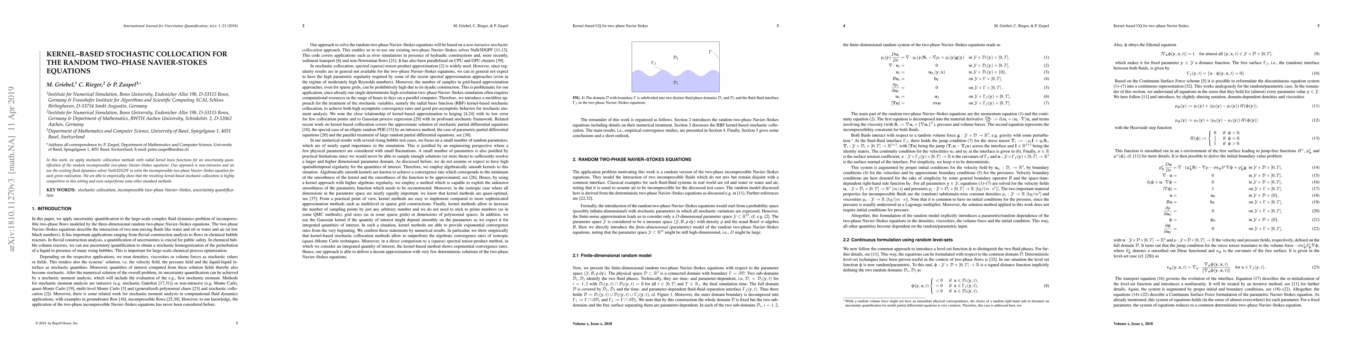 This paper employs kernel-based stochastic collocation with radial basis functions to quantify uncertainties in random two-phase Navier-Stokes equations. The non-intrusive method leverages an existing solver, NaSt3DGPF, and demonstrates superior performance compared to other standard techniques.