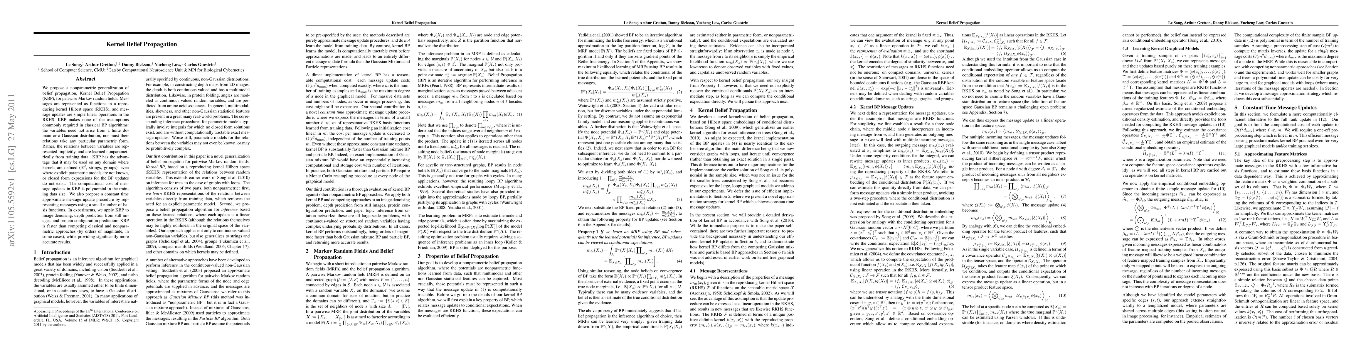 We propose a nonparametric generalization of belief propagation, Kernel Belief Propagation (KBP), for pairwise Markov random fields. Messages are represented as functions in a reproducing kernel Hilbert space (RKHS), and message updates are simple linear operations in the RKHS. KBP makes none of the assumptions commonly required in classical BP algorithms: the variables need not arise from a finite domain or a Gaussian distribution, nor must their relations take any particular parametric form. Rather, the relations between variables are represented implicitly, and are learned nonparametrically from training data. KBP has the advantage that it may be used on any domain where kernels are defined (Rd, strings, groups), even where explicit parametric models are not known, or closed form expressions for the BP updates do not exist. The computational cost of message updates in KBP is polynomial in the training data size. We also propose a constant time approximate message update procedure by representing messages using a small number of basis functions. In experiments, we apply KBP to image denoising, depth prediction from still images, and protein configuration prediction: KBP is faster than competing classical and nonparametric approaches (by orders of magnitude, in some cases), while providing significantly more accurate results.
