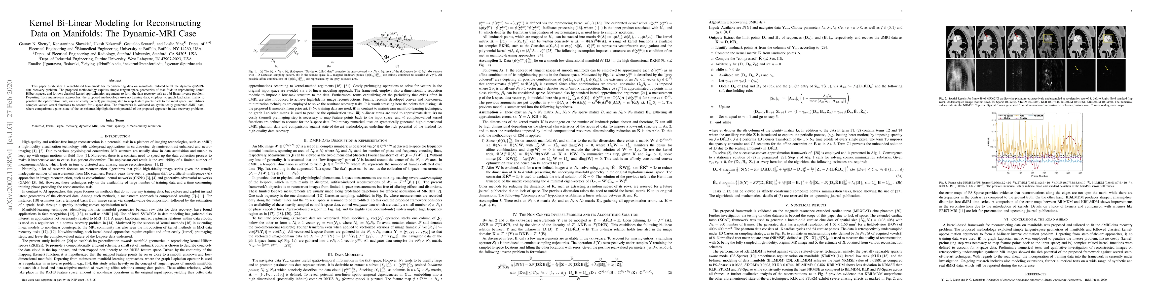 This paper establishes a kernel-based framework for reconstructing data on manifolds, tailored to fit the dynamic-(d)MRI-data recovery problem. The proposed methodology exploits simple tangent-space geometries of manifolds in reproducing kernel Hilbert spaces and follows classical kernel-approximation arguments to form the data-recovery task as a bi-linear inverse problem. Departing from mainstream approaches, the proposed methodology uses no training data, employs no graph Laplacian matrix to penalize the optimization task, uses no costly (kernel) pre-imaging step to map feature points back to the input space, and utilizes complex-valued kernel functions to account for k-space data. The framework is validated on synthetically generated dMRI data, where comparisons against state-of-the-art schemes highlight the rich potential of the proposed approach in data-recovery problems.