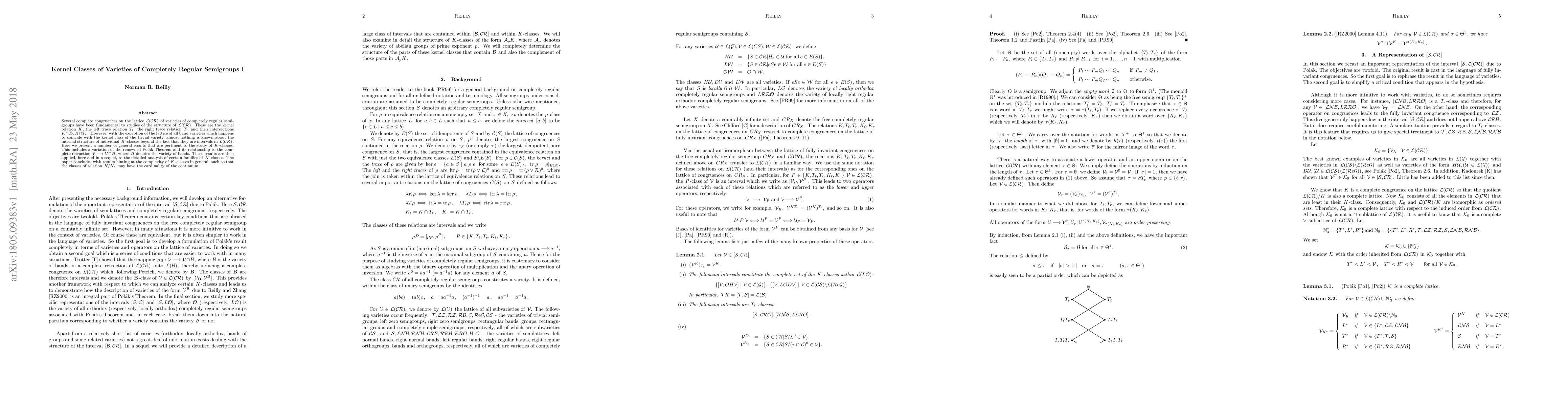 Several complete congruences on the lattice L(CR) of varieties of completely regular semi- groups have been fundamental to studies of the structure of L(CR). These are the kernel relation K , the left trace relation Tl , the right trace relation Tr and their intersections K\capTl,K\cap Tr . However, with the exception of the lattice of all band varieties which happens to coincide with the kernel class of the trivial variety, almost nothing is known about the internal structure of individual K-classes beyond the fact that they are intervals in L(CR). Here we present a number of general results that are pertinent to the study of K -classes. This includes a variation of the renowned Polak Theorem and its relationship to the complete retraction V -> V \cap B , where B denotes the variety of bands. These results are then applied, here and in a sequel, to the detailed analysis of certain families of K -classes. The paper concludes with results hinting at the complexity of K -classes in general, such as that the classes of relation K/Kl may have the cardinality of the continuum.