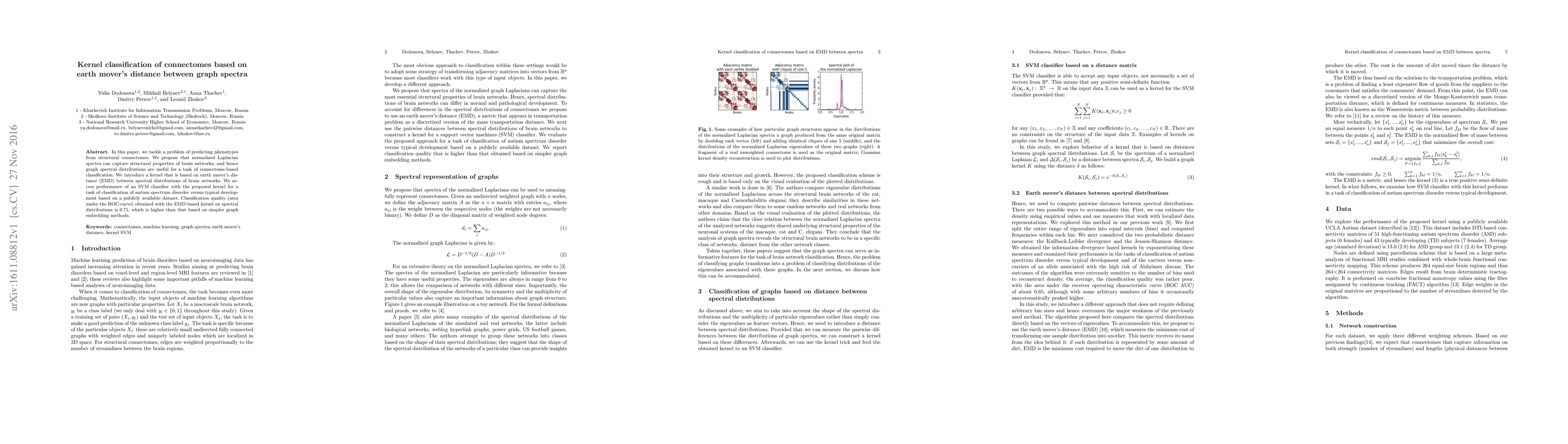 This paper proposes a kernel classification method using earth mover's distance between normalized Laplacian spectra for brain network classification. The method achieves higher classification quality (0.71 AUC) for distinguishing autism spectrum disorder from typical development compared to simpler graph embedding methods.