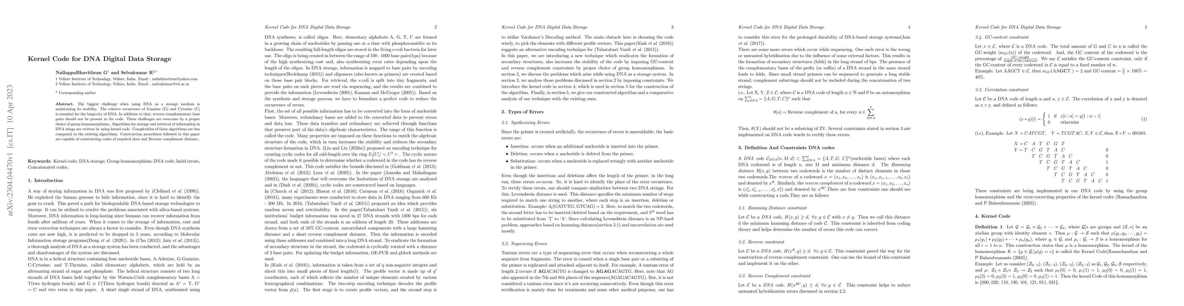 This paper presents a kernel code algorithm for DNA digital data storage that enhances stability by optimizing the Guanine (G) and Cytosine (C) ratio and avoiding reverse complementary base pairs, achieving lower complexity compared to existing methods, and enabling construction of codes of specified sizes and reverse complement distances.