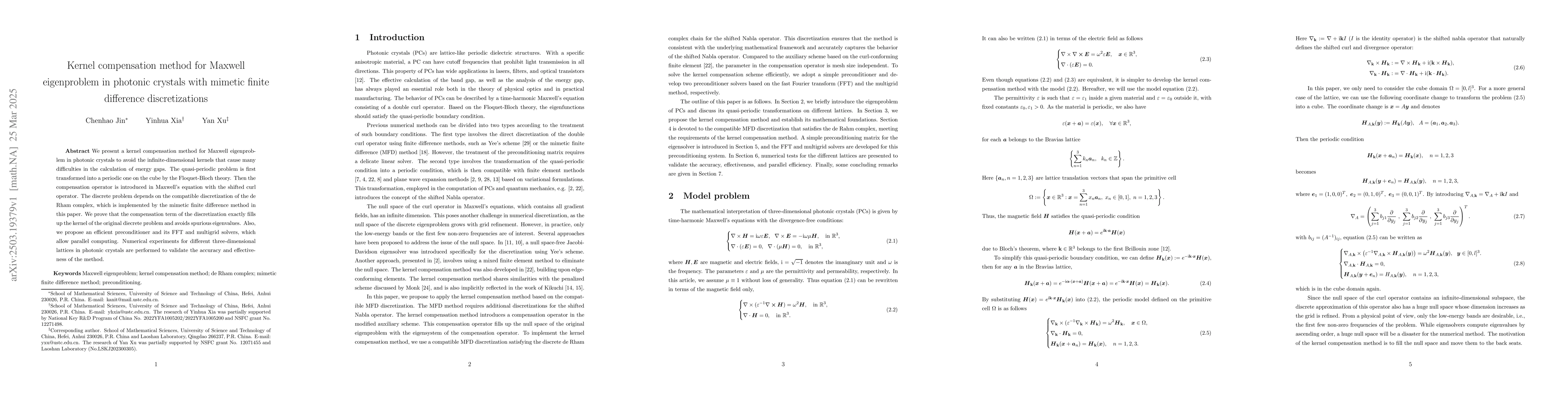 The research employs a kernel compensation method for Maxwell eigenproblem in photonic crystals, transforming the quasi-periodic problem into a periodic one using Floquet-Bloch theory. It introduces a compensation operator in Maxwell's equation with a shifted curl operator, discretized via the mimetic finite difference method.