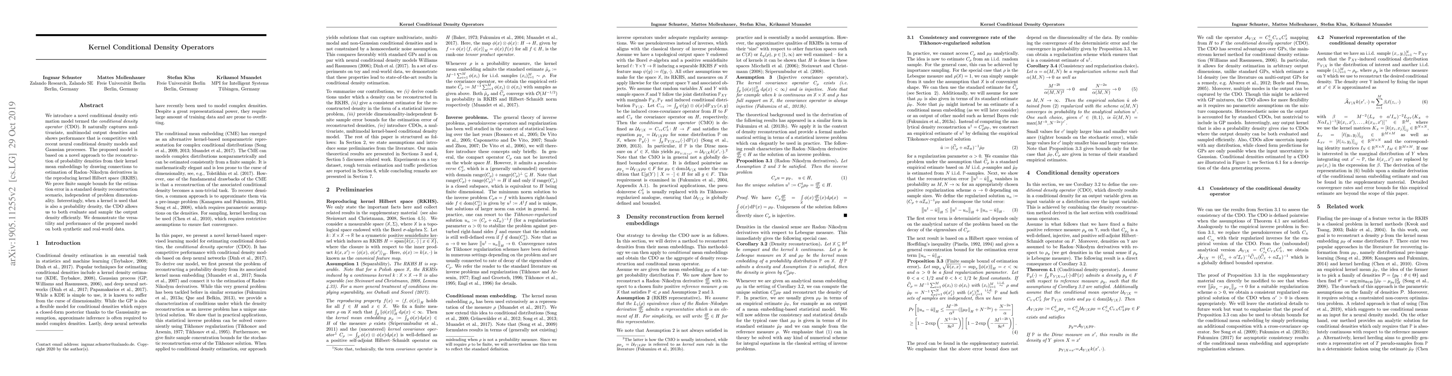 The paper introduces a conditional density operator (CDO) model for estimating multivariate, multimodal output densities, showing competitive performance against neural models and Gaussian processes. The CDO reconstructs probability densities from kernel mean embeddings, with proven finite sample bounds for estimation error, and allows efficient evaluation and sampling when using a kernel that is also a probability density.