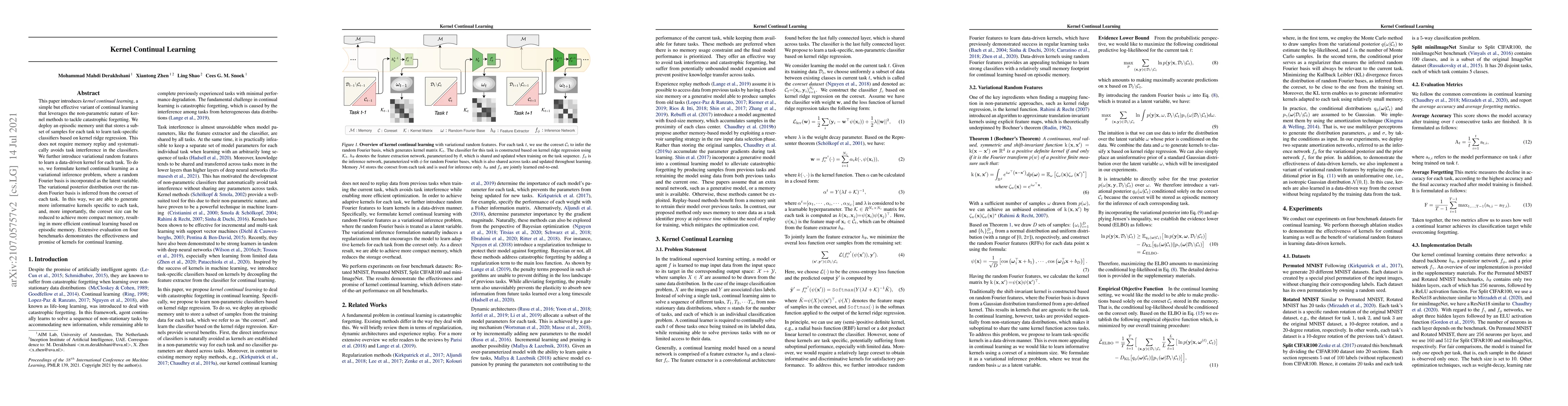 This paper proposes kernel continual learning, which uses kernel ridge regression and episodic memory to mitigate catastrophic forgetting without memory replay. It employs variational random features to create task-specific kernels, formulated as a variational inference problem, leading to efficient and effective continual learning.
