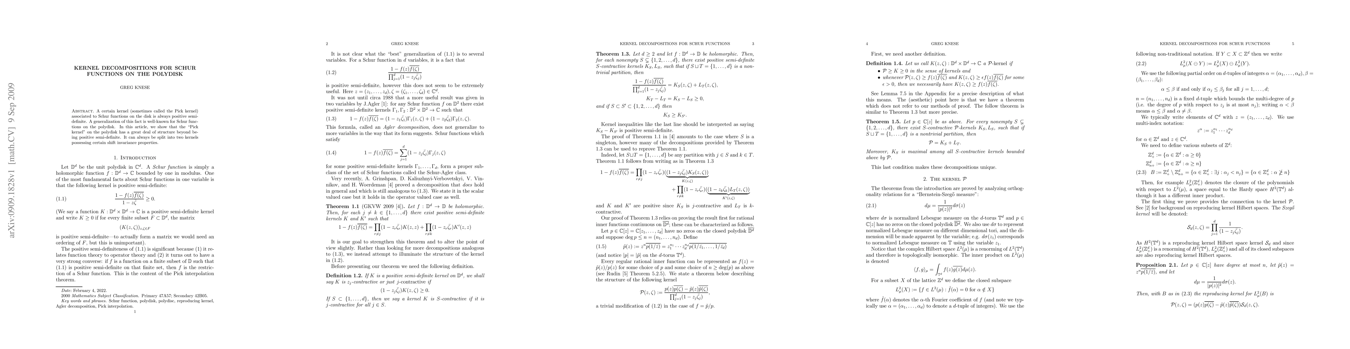 A study on Schur functions on the polydisk reveals that the Pick kernel can be decomposed into two kernels with shift invariance properties, offering new insights into its structure.