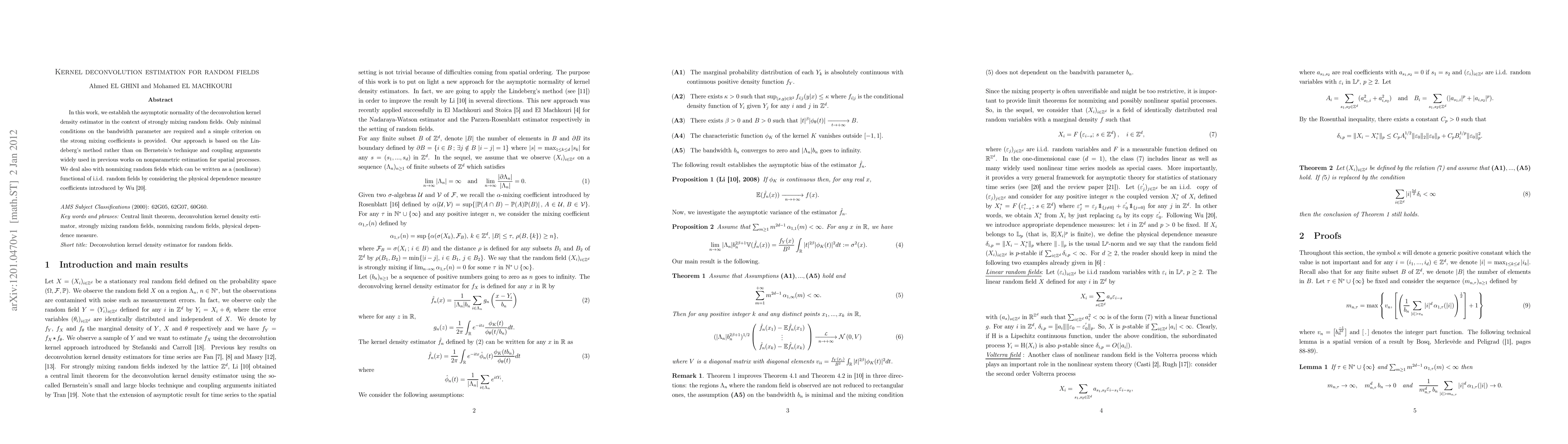 The paper establishes the asymptotic normality of the deconvolution kernel density estimator for strongly mixing random fields, using minimal conditions on the bandwidth parameter and a criterion on strong mixing coefficients. The approach employs Lindeberg's method, distinguishing it from previous works that relied on Bernstein's technique and coupling arguments.