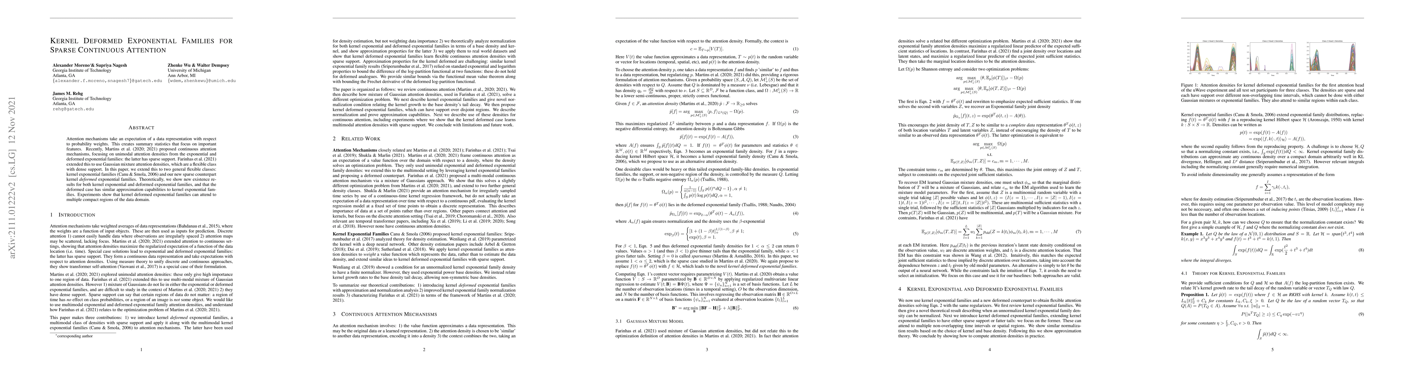 This paper introduces kernel deformed exponential families for sparse continuous attention mechanisms, extending previous work on kernel exponential families. It demonstrates theoretical existence and approximation capabilities, and shows experimentally that the new model can focus on multiple compact data regions.