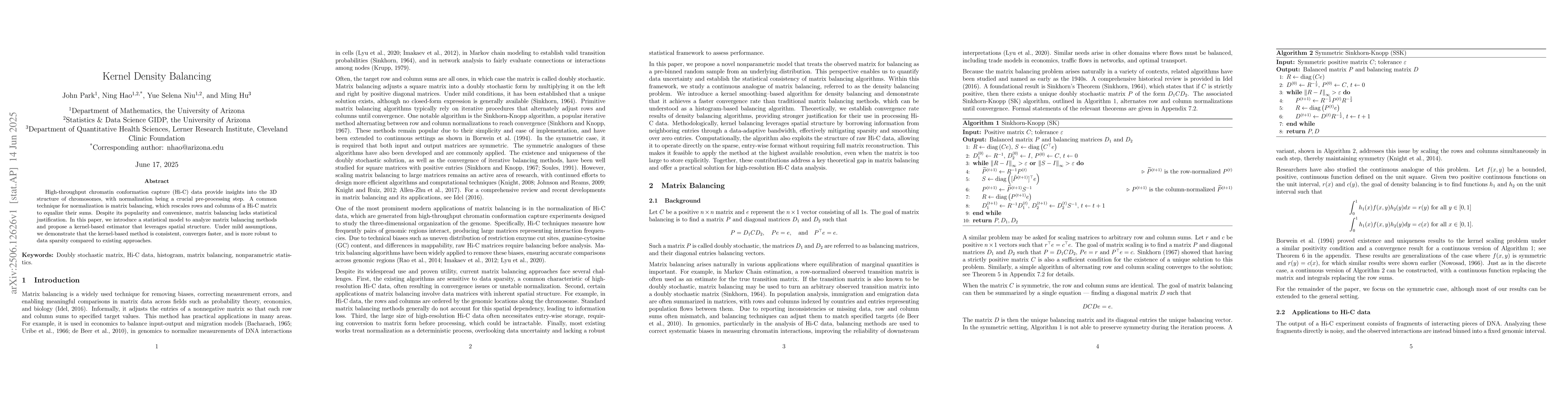 High-throughput chromatin conformation capture (Hi-C) data provide insights into the 3D structure of chromosomes, with normalization being a crucial pre-processing step. A common technique for normalization is matrix balancing, which rescales rows and columns of a Hi-C matrix to equalize their sums. Despite its popularity and convenience, matrix balancing lacks statistical justification. In this paper, we introduce a statistical model to analyze matrix balancing methods and propose a kernel-based estimator that leverages spatial structure. Under mild assumptions, we demonstrate that the kernel-based method is consistent, converges faster, and is more robust to data sparsity compared to existing approaches.