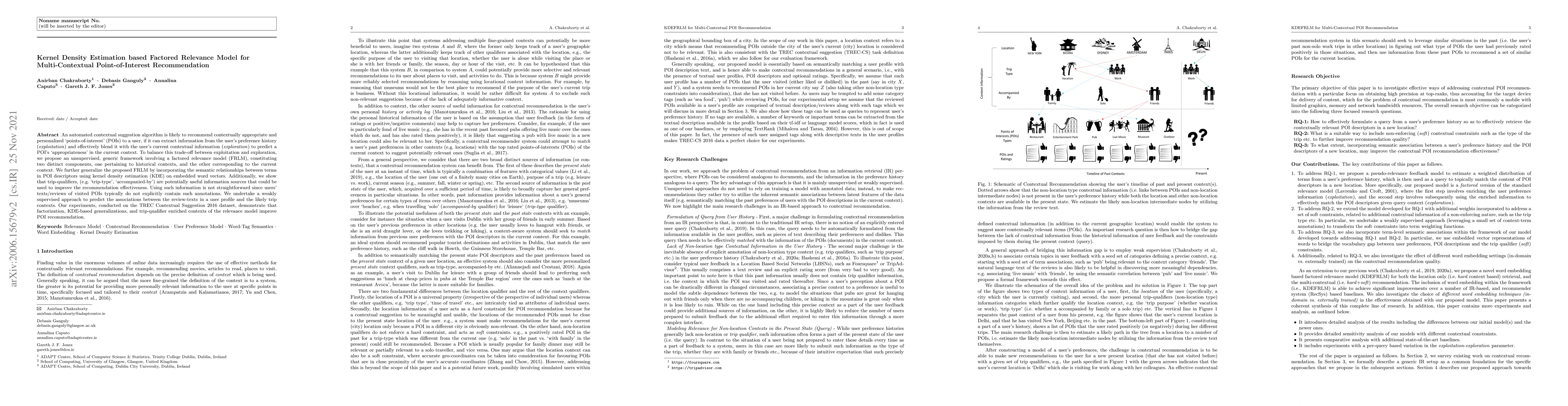 An automated contextual suggestion algorithm is likely to recommend contextually appropriate and personalized 'points-of-interest' (POIs) to a user, if it can extract information from the user's preference history (exploitation) and effectively blend it with the user's current contextual information (exploration) to predict a POI's 'appropriateness' in the current context. To balance this trade-off between exploitation and exploration, we propose an unsupervised, generic framework involving a factored relevance model (FRLM), constituting two distinct components, one pertaining to historical contexts, and the other corresponding to the current context. We further generalize the proposed FRLM by incorporating the semantic relationships between terms in POI descriptors using kernel density estimation (KDE) on embedded word vectors. Additionally, we show that trip-qualifiers, (e.g. 'trip-type', 'accompanied-by') are potentially useful information sources that could be used to improve the recommendation effectiveness. Using such information is not straight forward since users' texts/reviews of visited POIs typically do not explicitly contain such annotations. We undertake a weakly supervised approach to predict the associations between the review-texts in a user profile and the likely trip contexts. Our experiments, conducted on the TREC contextual suggestion 2016 dataset, demonstrate that factorization, KDE-based generalizations, and trip-qualifier enriched contexts of the relevance model improve POI recommendation.