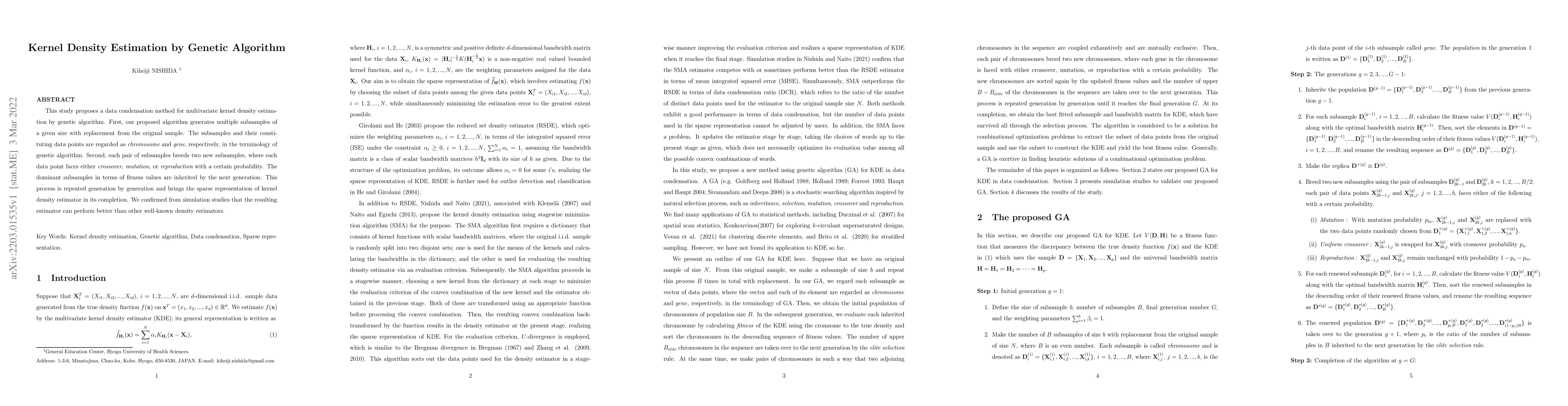 A new method for kernel density estimation uses a genetic algorithm to generate subsamples from an original dataset, then iteratively breeds and selects the best subsamples to create a more accurate estimate. The resulting estimator performs better than other well-known methods.