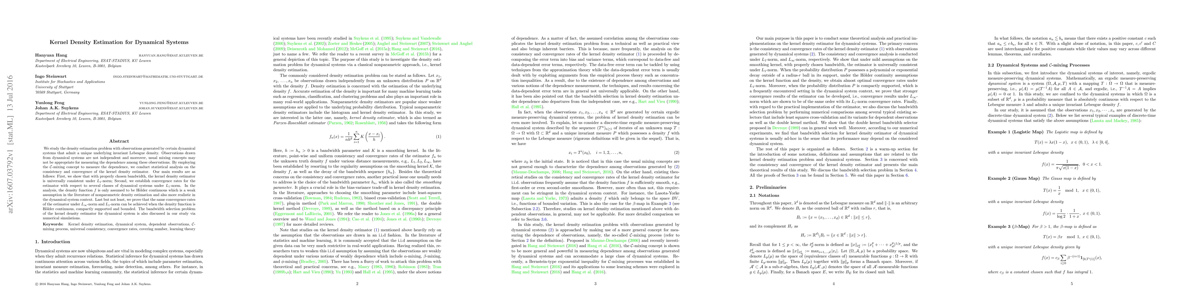 This paper investigates kernel density estimation for observations from dynamical systems, employing $\mathcal{C}$-mixing to measure dependence. It demonstrates universal consistency and convergence rates for the kernel density estimator under $L_1$-norm, assuming only H\"{o}lder continuity of the density function.