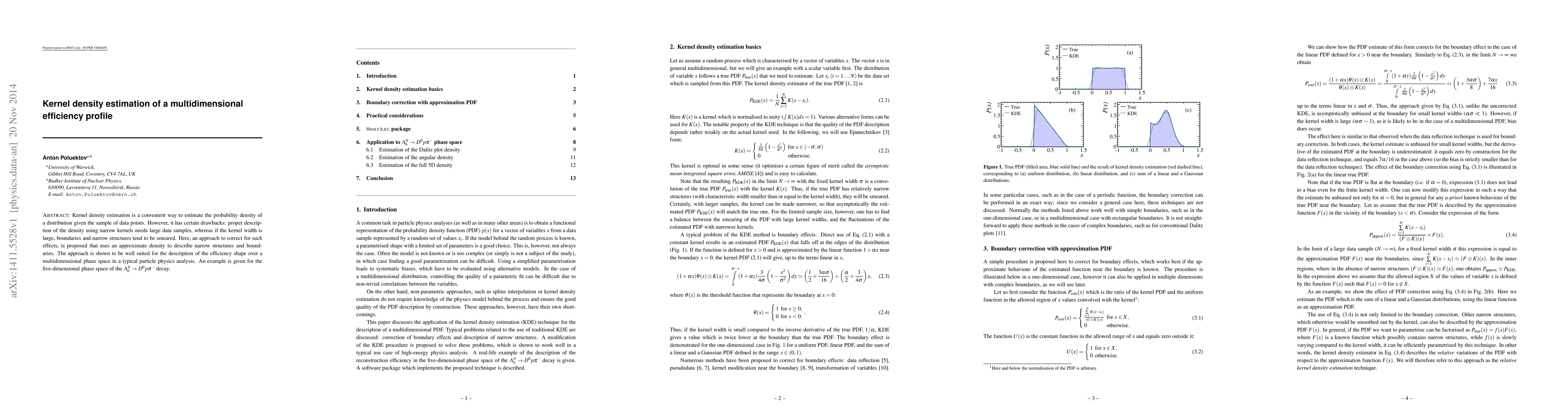 Kernel density estimation is a convenient way to estimate the probability density of a distribution given the sample of data points. However, it has certain drawbacks: proper description of the density using narrow kernels needs large data samples, whereas if the kernel width is large, boundaries and narrow structures tend to be smeared. Here, an approach to correct for such effects, is proposed that uses an approximate density to describe narrow structures and boundaries. The approach is shown to be well suited for the description of the efficiency shape over a multidimensional phase space in a typical particle physics analysis. An example is given for the five-dimensional phase space of the $\Lambda_b^0\to D^0p\pi$ decay.