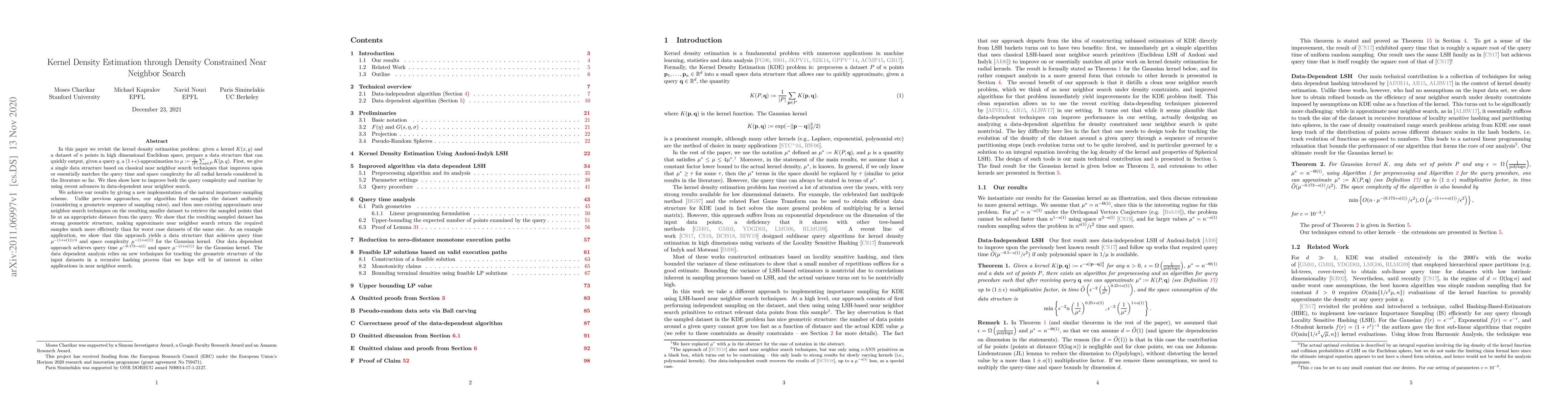 In this paper we revisit the kernel density estimation problem: given a kernel $K(x, y)$ and a dataset of $n$ points in high dimensional Euclidean space, prepare a data structure that can quickly output, given a query $q$, a $(1+\epsilon)$-approximation to $\mu:=\frac1{|P|}\sum_{p\in P} K(p, q)$. First, we give a single data structure based on classical near neighbor search techniques that improves upon or essentially matches the query time and space complexity for all radial kernels considered in the literature so far. We then show how to improve both the query complexity and runtime by using recent advances in data-dependent near neighbor search. We achieve our results by giving a new implementation of the natural importance sampling scheme. Unlike previous approaches, our algorithm first samples the dataset uniformly (considering a geometric sequence of sampling rates), and then uses existing approximate near neighbor search techniques on the resulting smaller dataset to retrieve the sampled points that lie at an appropriate distance from the query. We show that the resulting sampled dataset has strong geometric structure, making approximate near neighbor search return the required samples much more efficiently than for worst case datasets of the same size. As an example application, we show that this approach yields a data structure that achieves query time $\mu^{-(1+o(1))/4}$ and space complexity $\mu^{-(1+o(1))}$ for the Gaussian kernel. Our data dependent approach achieves query time $\mu^{-0.173-o(1)}$ and space $\mu^{-(1+o(1))}$ for the Gaussian kernel. The data dependent analysis relies on new techniques for tracking the geometric structure of the input datasets in a recursive hashing process that we hope will be of interest in other applications in near neighbor search.