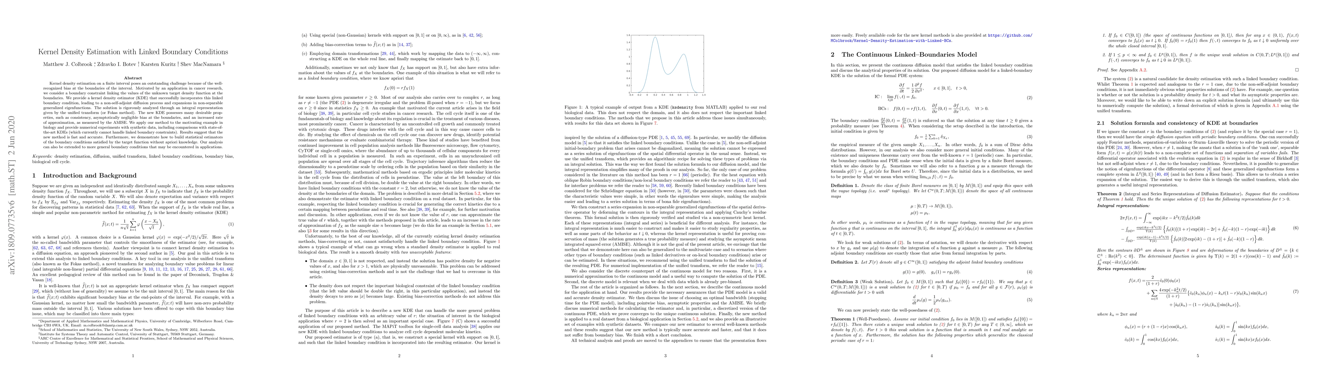 Kernel density estimation on a finite interval poses an outstanding challenge because of the well-recognized bias at the boundaries of the interval. Motivated by an application in cancer research, we consider a boundary constraint linking the values of the unknown target density function at the boundaries. We provide a kernel density estimator (KDE) that successfully incorporates this linked boundary condition, leading to a non-self-adjoint diffusion process and expansions in non-separable generalized eigenfunctions. The solution is rigorously analyzed through an integral representation given by the unified transform (or Fokas method). The new KDE possesses many desirable properties, such as consistency, asymptotically negligible bias at the boundaries, and an increased rate of approximation, as measured by the AMISE. We apply our method to the motivating example in biology and provide numerical experiments with synthetic data, including comparisons with state-of-the-art KDEs (which currently cannot handle linked boundary constraints). Results suggest that the new method is fast and accurate. Furthermore, we demonstrate how to build statistical estimators of the boundary conditions satisfied by the target function without apriori knowledge. Our analysis can also be extended to more general boundary conditions that may be encountered in applications.