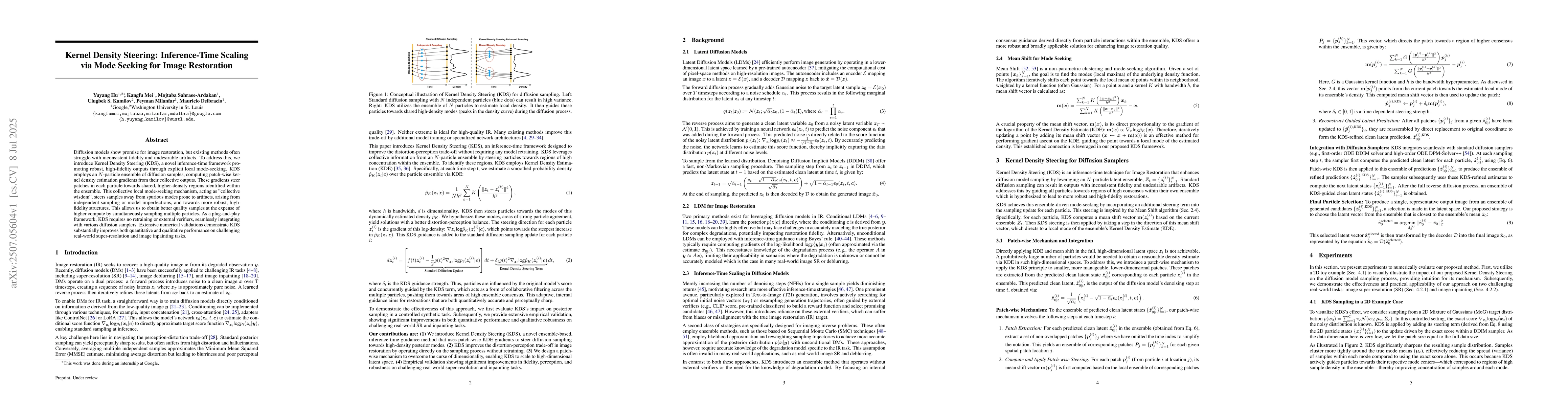 Diffusion models show promise for image restoration, but existing methods often struggle with inconsistent fidelity and undesirable artifacts. To address this, we introduce Kernel Density Steering (KDS), a novel inference-time framework promoting robust, high-fidelity outputs through explicit local mode-seeking. KDS employs an $N$-particle ensemble of diffusion samples, computing patch-wise kernel density estimation gradients from their collective outputs. These gradients steer patches in each particle towards shared, higher-density regions identified within the ensemble. This collective local mode-seeking mechanism, acting as "collective wisdom", steers samples away from spurious modes prone to artifacts, arising from independent sampling or model imperfections, and towards more robust, high-fidelity structures. This allows us to obtain better quality samples at the expense of higher compute by simultaneously sampling multiple particles. As a plug-and-play framework, KDS requires no retraining or external verifiers, seamlessly integrating with various diffusion samplers. Extensive numerical validations demonstrate KDS substantially improves both quantitative and qualitative performance on challenging real-world super-resolution and image inpainting tasks.