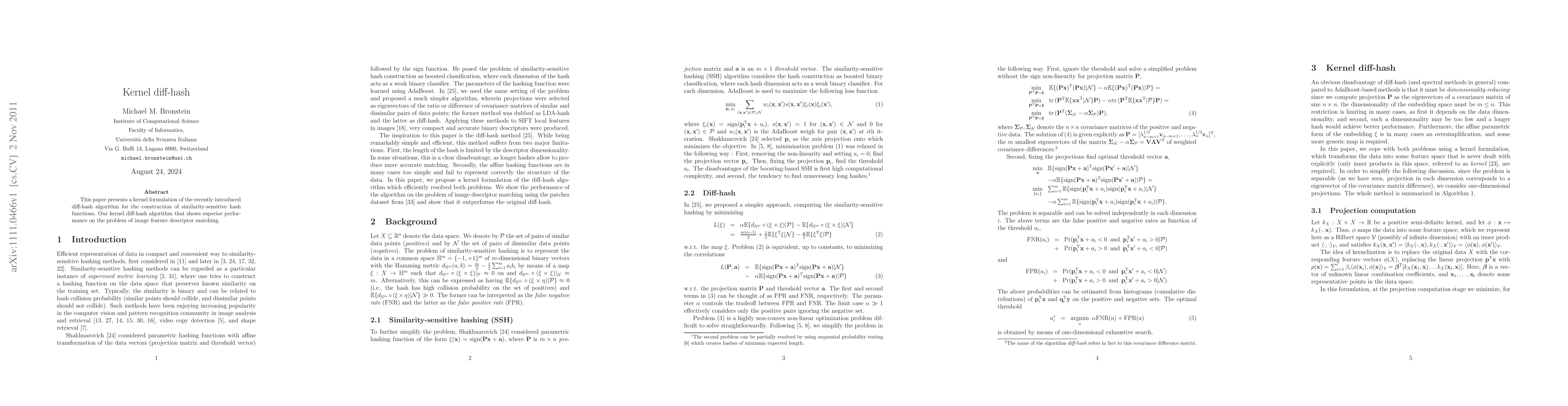 A new algorithm called kernel diff-hash is introduced for creating hash functions that can match features in images with high accuracy. It outperforms existing methods on image feature descriptor matching tasks.