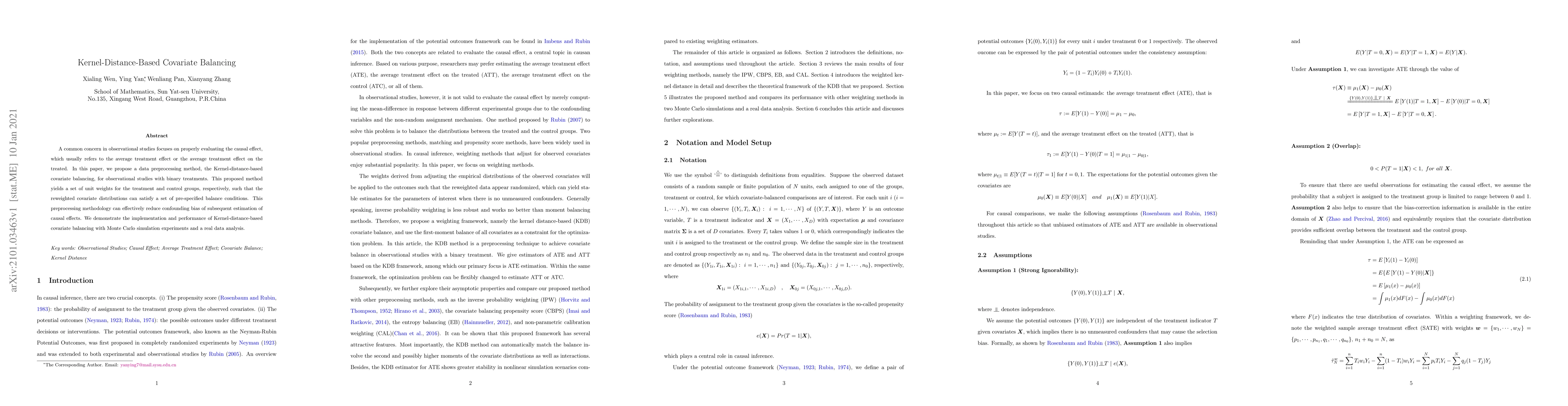 This paper introduces a Kernel-distance-based covariate balancing method to reduce confounding bias in observational studies with binary treatments, achieving balanced covariate distributions through unit weights, validated via simulation and real data analysis.