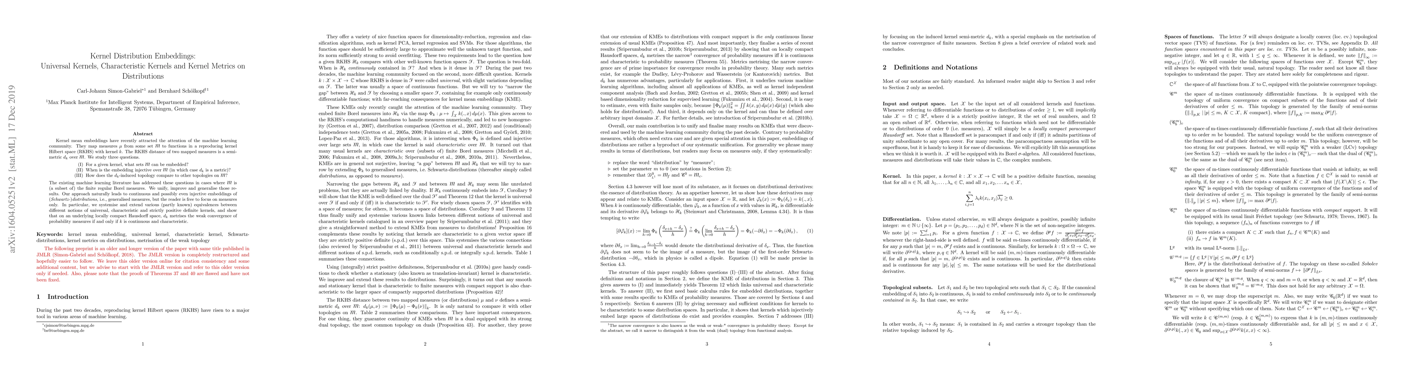 This paper explores kernel mean embeddings for measures and distributions, addressing the embedding of various sets, the conditions for injective embeddings, and the comparison of $d_k$-induced topology with other topologies. It unifies and extends existing results, particularly focusing on Schwartz distributions and equivalences between universal, characteristic, and strictly positive definite kernels.