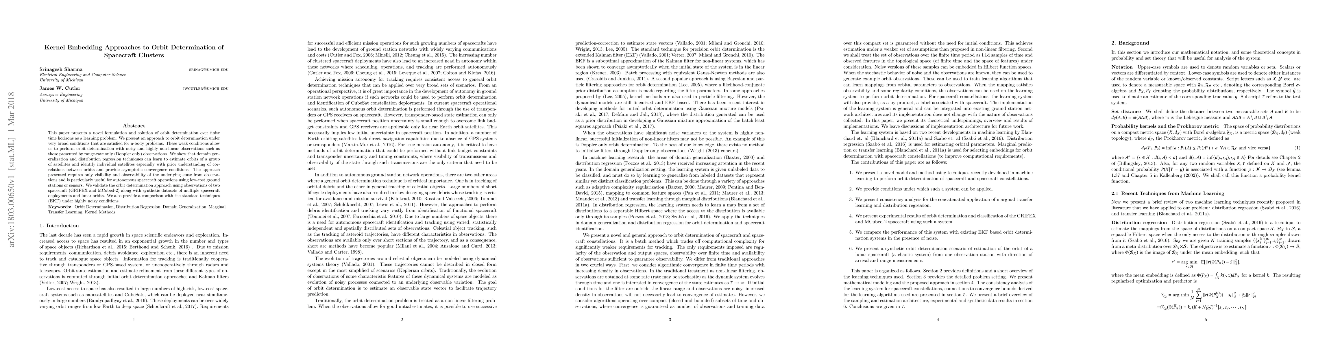 This paper presents a novel formulation and solution of orbit determination over finite time horizons as a learning problem. We present an approach to orbit determination under very broad conditions that are satisfied for n-body problems. These weak conditions allow us to perform orbit determination with noisy and highly non-linear observations such as those presented by range-rate only (Doppler only) observations. We show that domain generalization and distribution regression techniques can learn to estimate orbits of a group of satellites and identify individual satellites especially with prior understanding of correlations between orbits and provide asymptotic convergence conditions. The approach presented requires only visibility and observability of the underlying state from observations and is particularly useful for autonomous spacecraft operations using low-cost ground stations or sensors. We validate the orbit determination approach using observations of two spacecraft (GRIFEX and MCubed-2) along with synthetic datasets of multiple spacecraft deployments and lunar orbits. We also provide a comparison with the standard techniques (EKF) under highly noisy conditions.