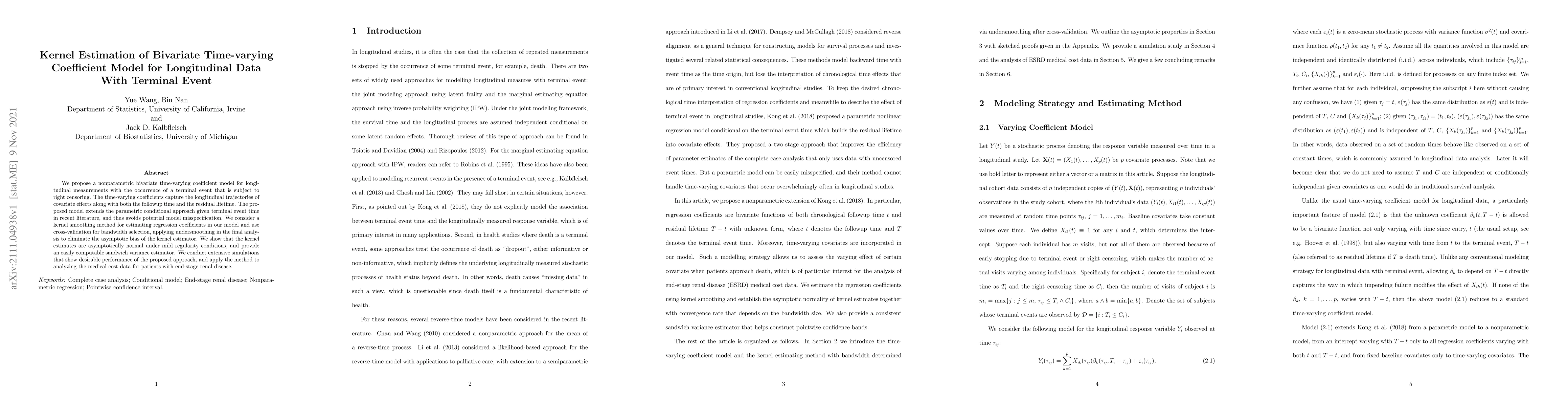This paper proposes a nonparametric model to analyze longitudinal data with a terminal event, using kernel smoothing for estimating time-varying coefficients. It shows good performance through simulations and applies the method to medical cost data for patients with end-stage renal disease.
