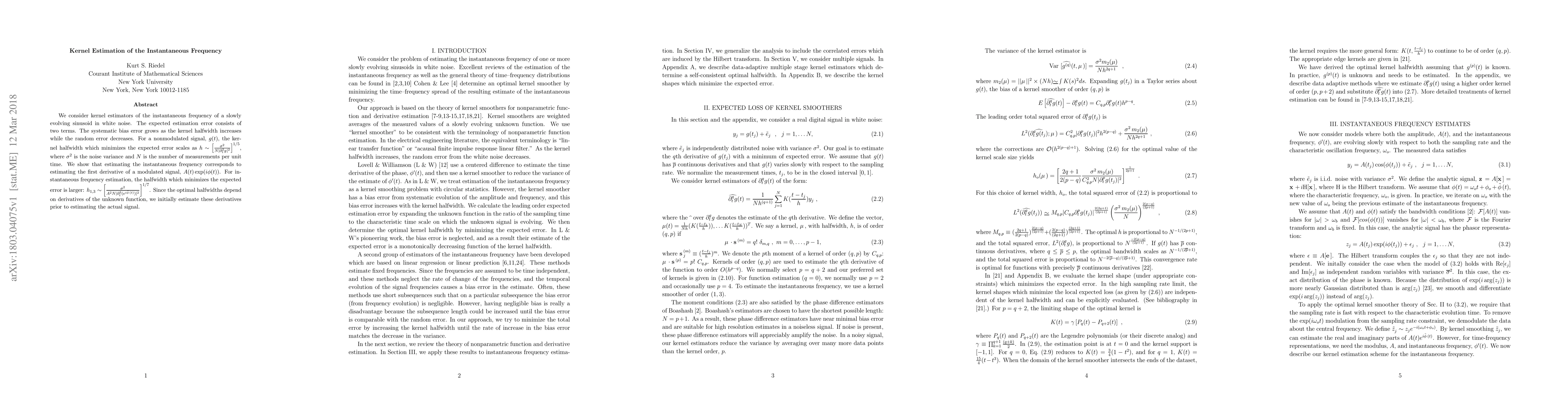 Research paper investigates how to estimate instantaneous frequency of a signal in white noise using kernel estimators. The optimal halfwidth for the estimator depends on the signal's derivatives and grows with increasing kernel width.