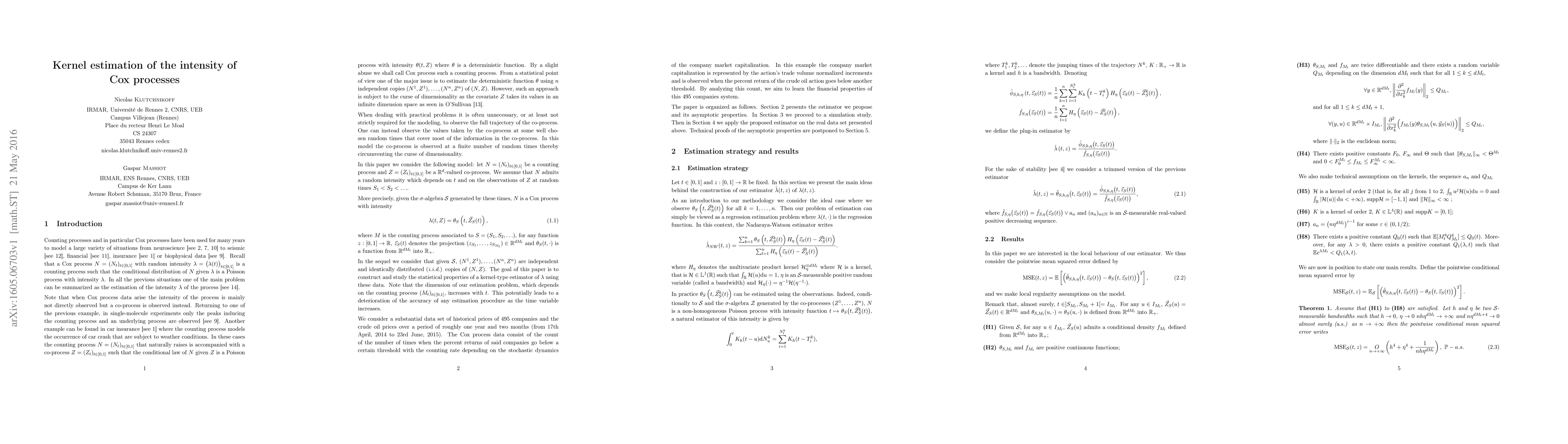 Counting processes often written $N=(N_t)_{t\in\mathbb{R}^+}$ are used in several applications of biostatistics, notably for the study of chronic diseases. In the case of respiratory illness it is natural to suppose that the count of the visits of a patient can be described by such a process which intensity depends on environmental covariates. Cox processes (also called doubly stochastic Poisson processes) allows to model such situations. The random intensity then writes $\lambda(t)=\theta(t,Z_t)$ where $\theta$ is a non-random function, $t\in\mathbb{R}^+$ is the time variable and $(Z_t)_{t\in\mathbb{R}^+}$ is the $d$-dimensional covariates process. For a longitudinal study over $n$ patients, we observe $(N_t^k,Z_t^k)_{t\in\mathbb{R}^+}$ for $k=1,\ldots,n$. The intention is to estimate the intensity of the process using these observations and to study the properties of this estimator.