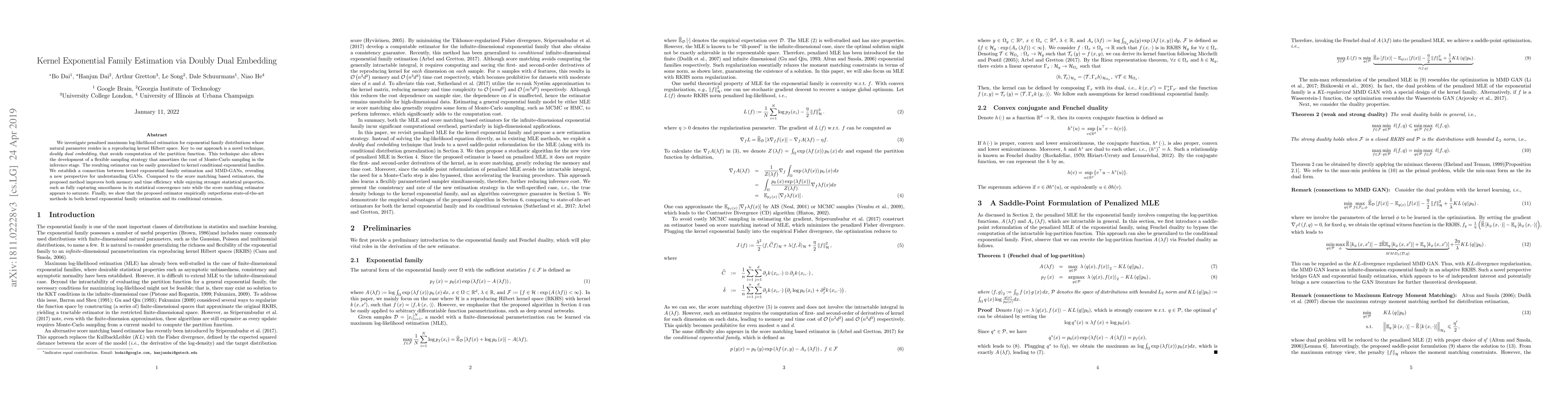 This paper proposes a novel doubly dual embedding technique for penalized maximum log-likelihood estimation of exponential family distributions in kernel Hilbert spaces, avoiding computation of the partition function and improving memory and time efficiency. The method also generalizes to kernel conditional exponential families and outperforms state-of-the-art estimators.