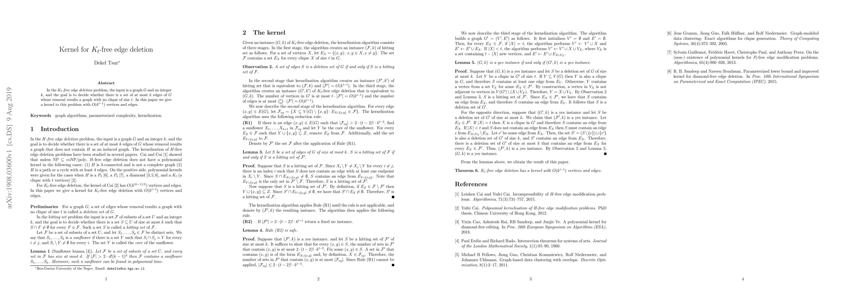 The paper provides a kernel for the Kt-free edge deletion problem with O(k^{t-1}) vertices and edges, helping to determine if removing at most k edges from a graph eliminates any clique of size t.