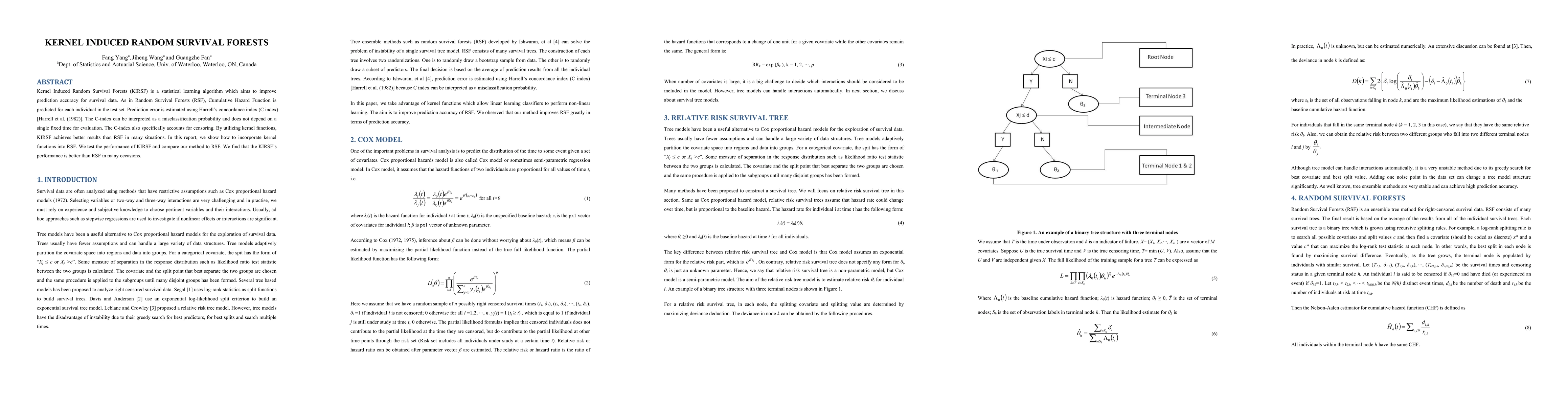 Kernel Induced Random Survival Forests (KIRSF) is a statistical learning algorithm which aims to improve prediction accuracy for survival data. As in Random Survival Forests (RSF), Cumulative Hazard Function is predicted for each individual in the test set. Prediction error is estimated using Harrell's concordance index (C index) [Harrell et al. (1982)]. The C-index can be interpreted as a misclassification probability and does not depend on a single fixed time for evaluation. The C-index also specifically accounts for censoring. By utilizing kernel functions, KIRSF achieves better results than RSF in many situations. In this report, we show how to incorporate kernel functions into RSF. We test the performance of KIRSF and compare our method to RSF. We find that the KIRSF's performance is better than RSF in many occasions.