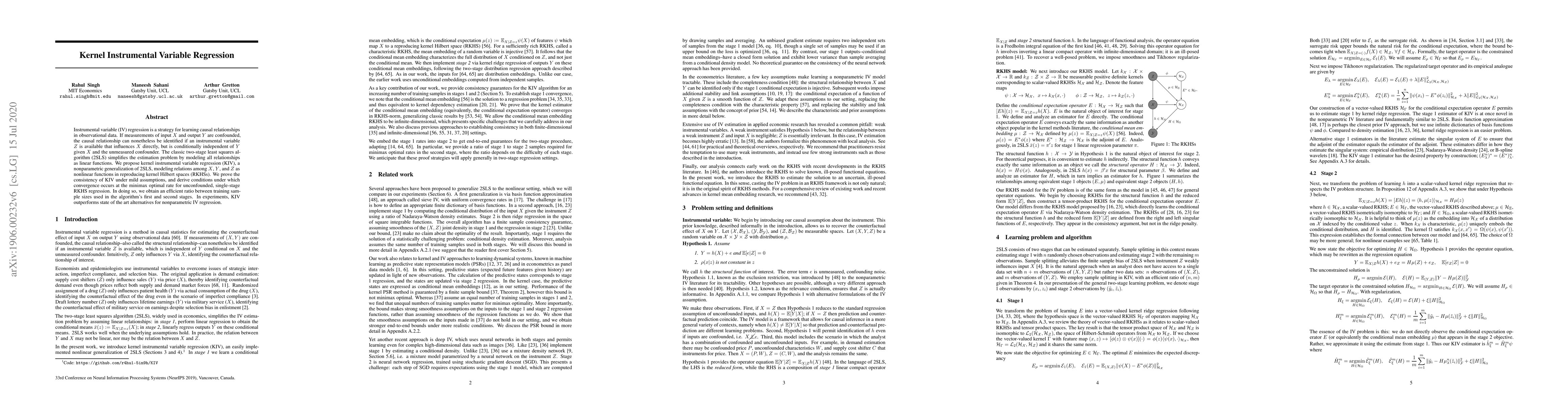 The paper proposes kernel instrumental variable regression (KIV), a nonparametric extension of the classic two-stage least squares algorithm, to model nonlinear relationships in causal inference. It proves KIV's consistency and optimal convergence rates, and demonstrates its superior performance over existing methods in experiments.