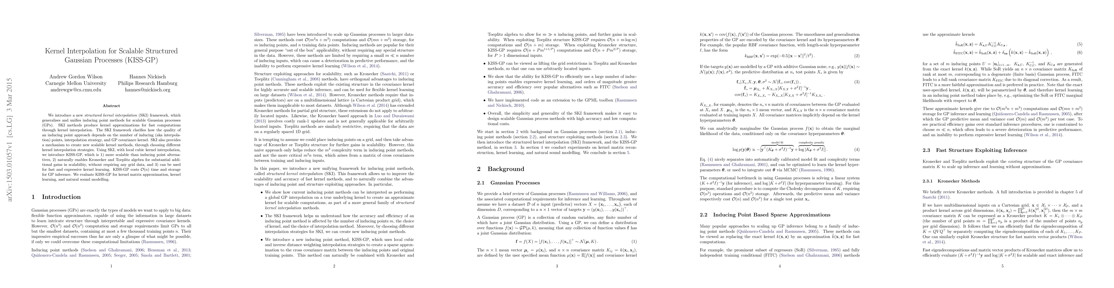 The paper introduces KISS-GP, a scalable structured kernel interpolation framework for Gaussian processes that generalizes inducing point methods. It achieves O(n) time and storage for GP inference and leverages local cubic kernel interpolation for fast computations, enabling substantial scalability gains through Kronecker and Toeplitz algebra.